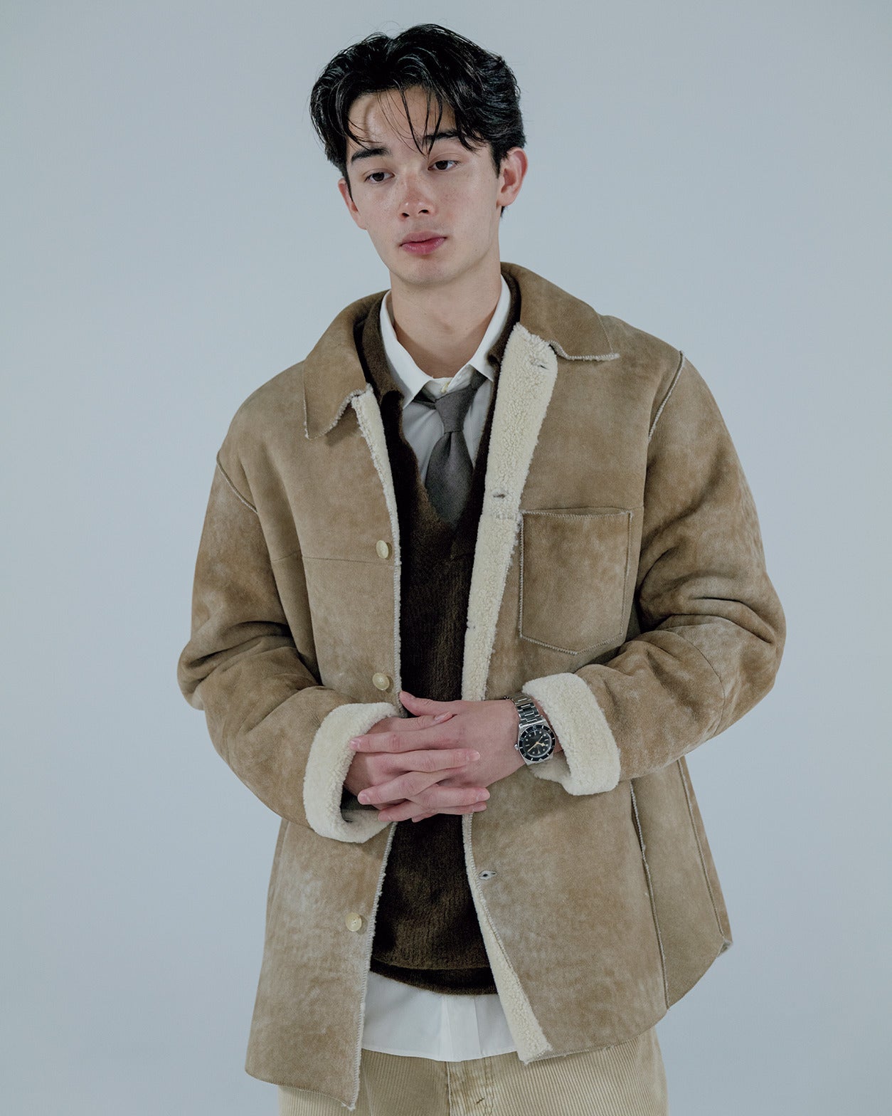 カタめかと思いきや、親しみやすくてあたたかみを感じる。テーラードジャケット代わりにムートンアウターをはおったタイドアップスタイルのムードは、質実剛健かつかわいげまであわせ持った時計とリンク。時計の針のカラーに合わせてベージュのアウター&パンツをチョイスし、気のきいた着こなしに。
