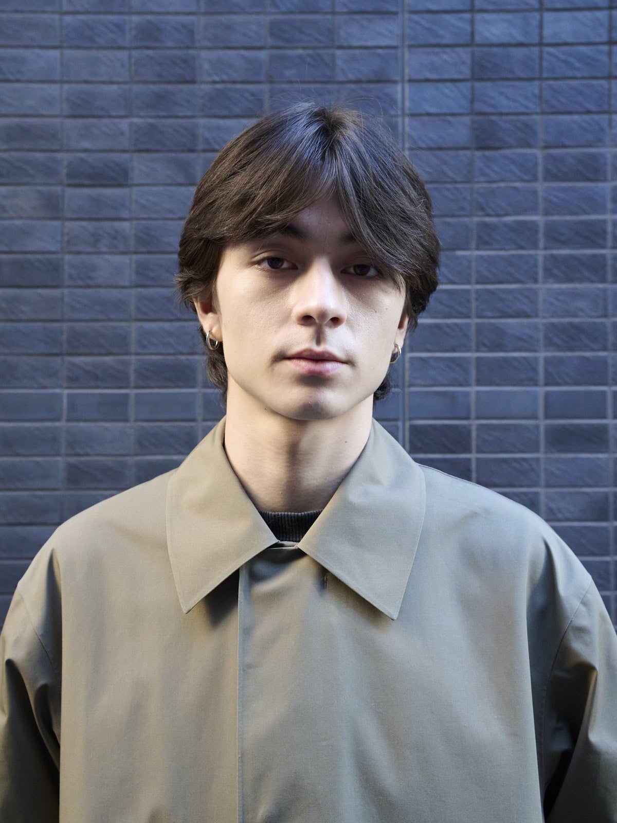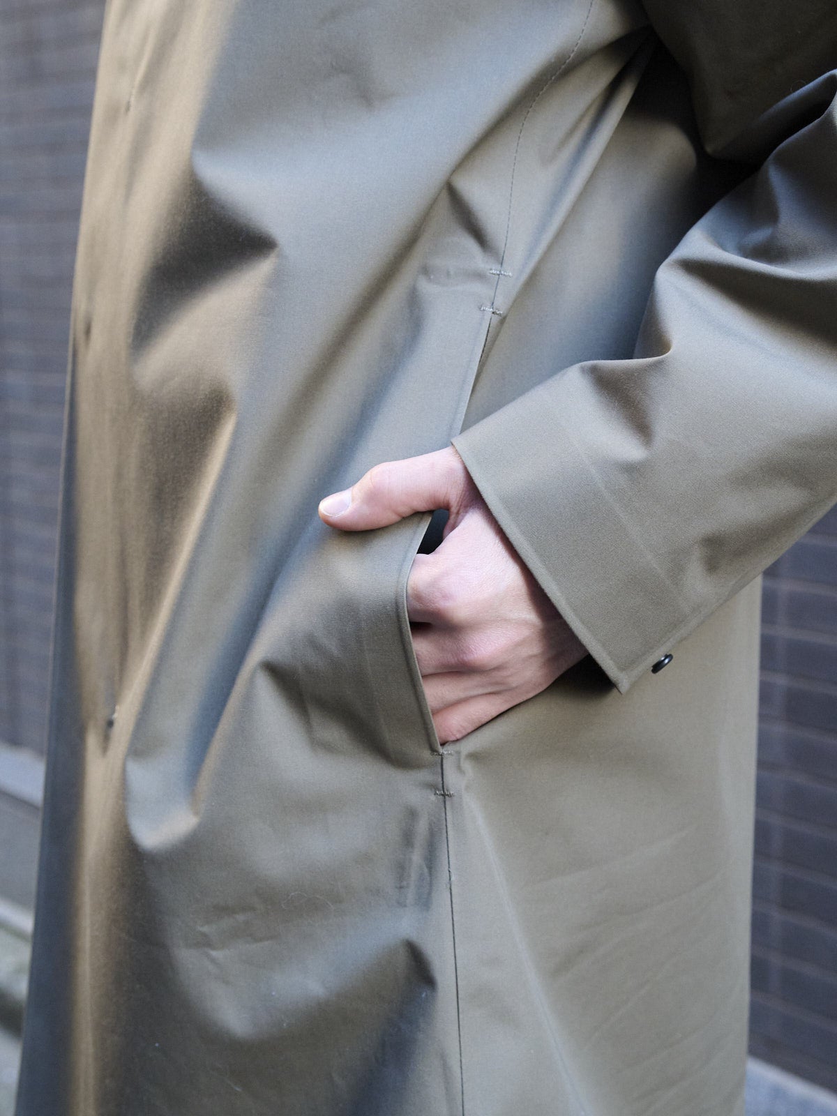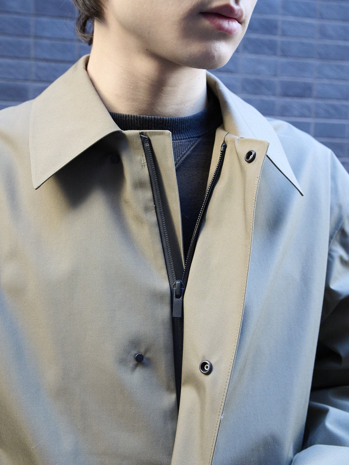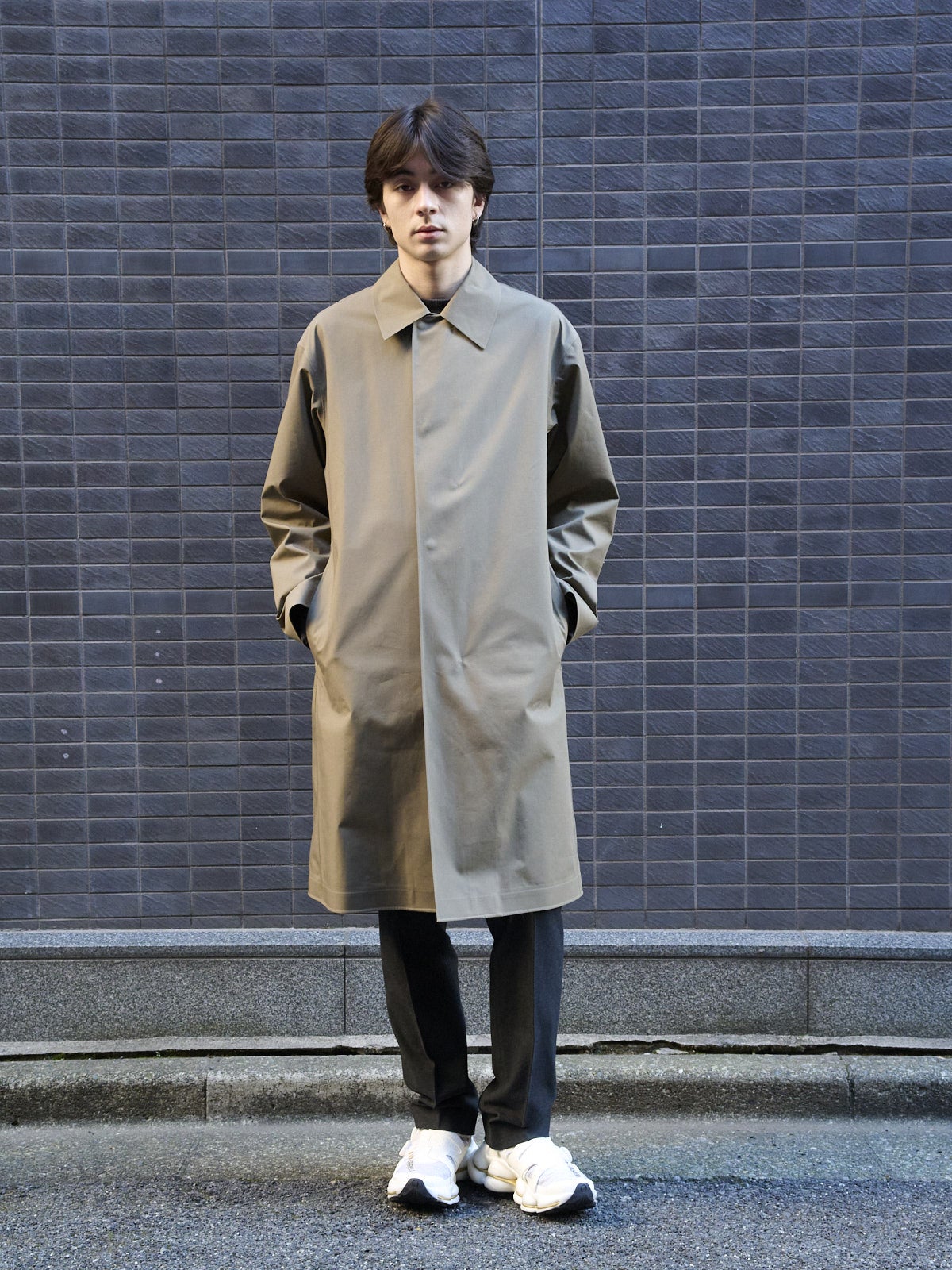 フロントはジップとスナップボタンの前立て仕様。オーバーコートらしくバサッと羽織っても決まるが、ボタンを上までしっかりと留めてシャープに着こなしてもサマになる。シームに合わせたサイドポケットのみのミニマルなルックスながら、耐久撥水、防風性、防水、透湿性を持った高機能素材を採用していて、機能面も文句ナシだ。