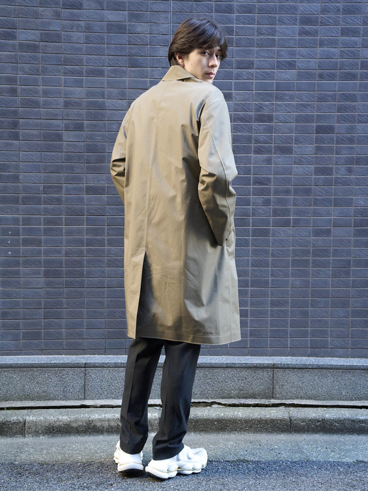 「ユニクロ:シー」のブロックテックステンカラーコートに、スリムなパンツでシルエットにメリハリをつけて。足元はメレルのボリュームスニーカーをチョイスし、コートのオーバーサイジングとバランスを取った。スニーカーはクリーンなホワイトを選ぶことで、コートの大人なムードをいかしたカジュアルシックな装いに。