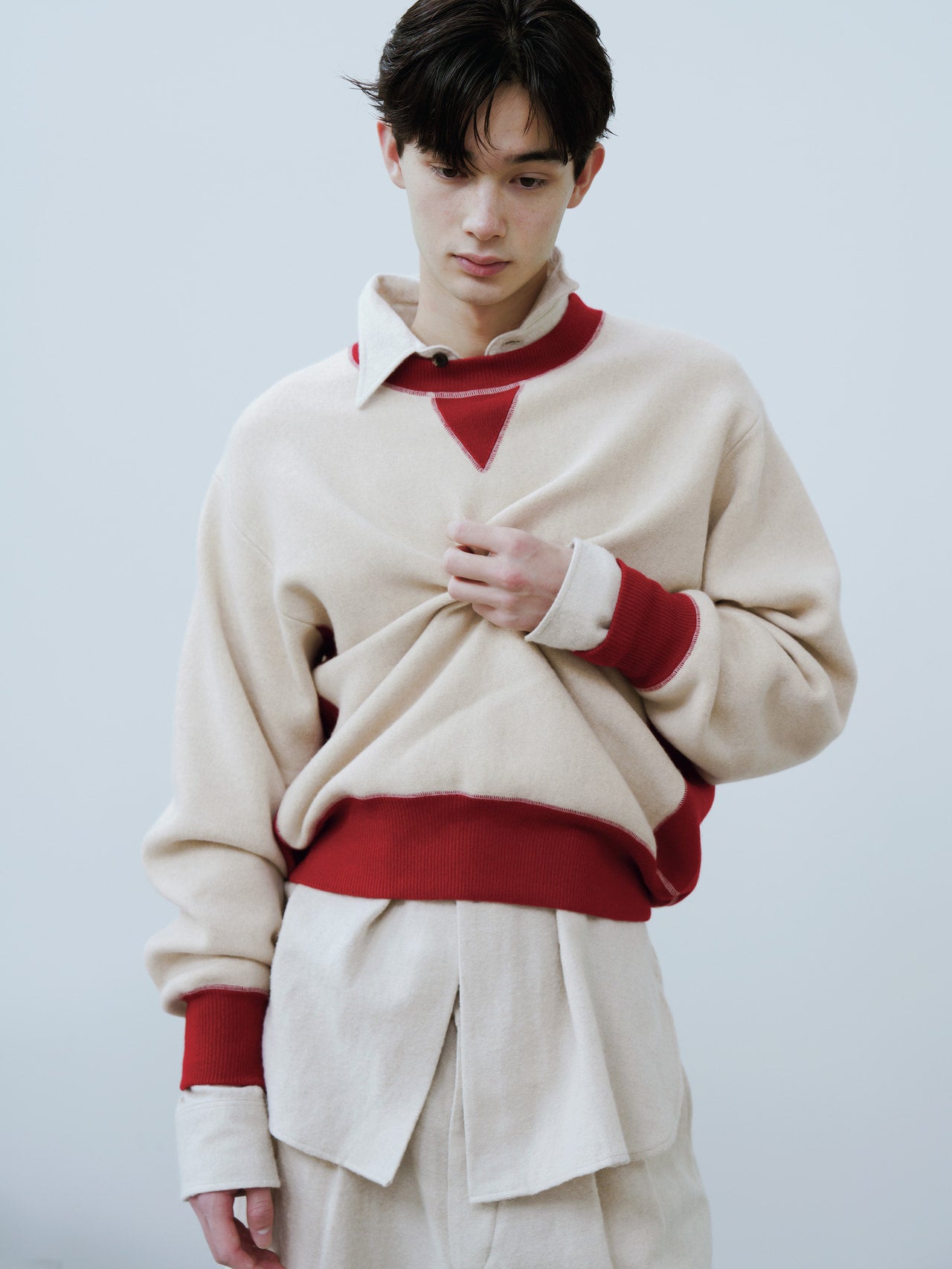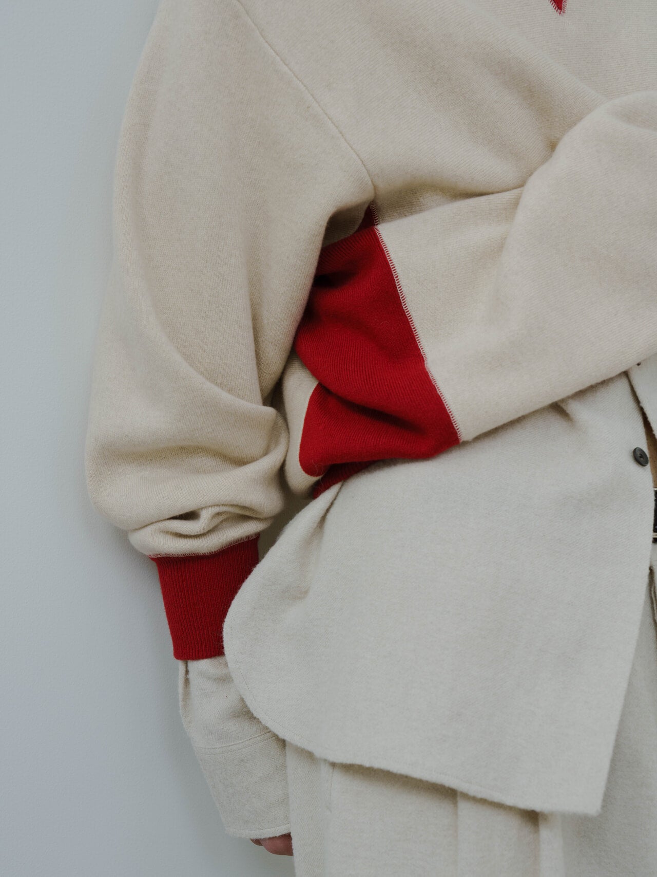 「保温性と保湿性に優れたカシミヤ100%で、軽くて柔らかい着心地が魅力。ヴィンテージの雰囲気をまとったVガセットとサイドのリブなどディテールもポイントです。随所に施された赤もコーディネートのアクセントにちょうどいい」。