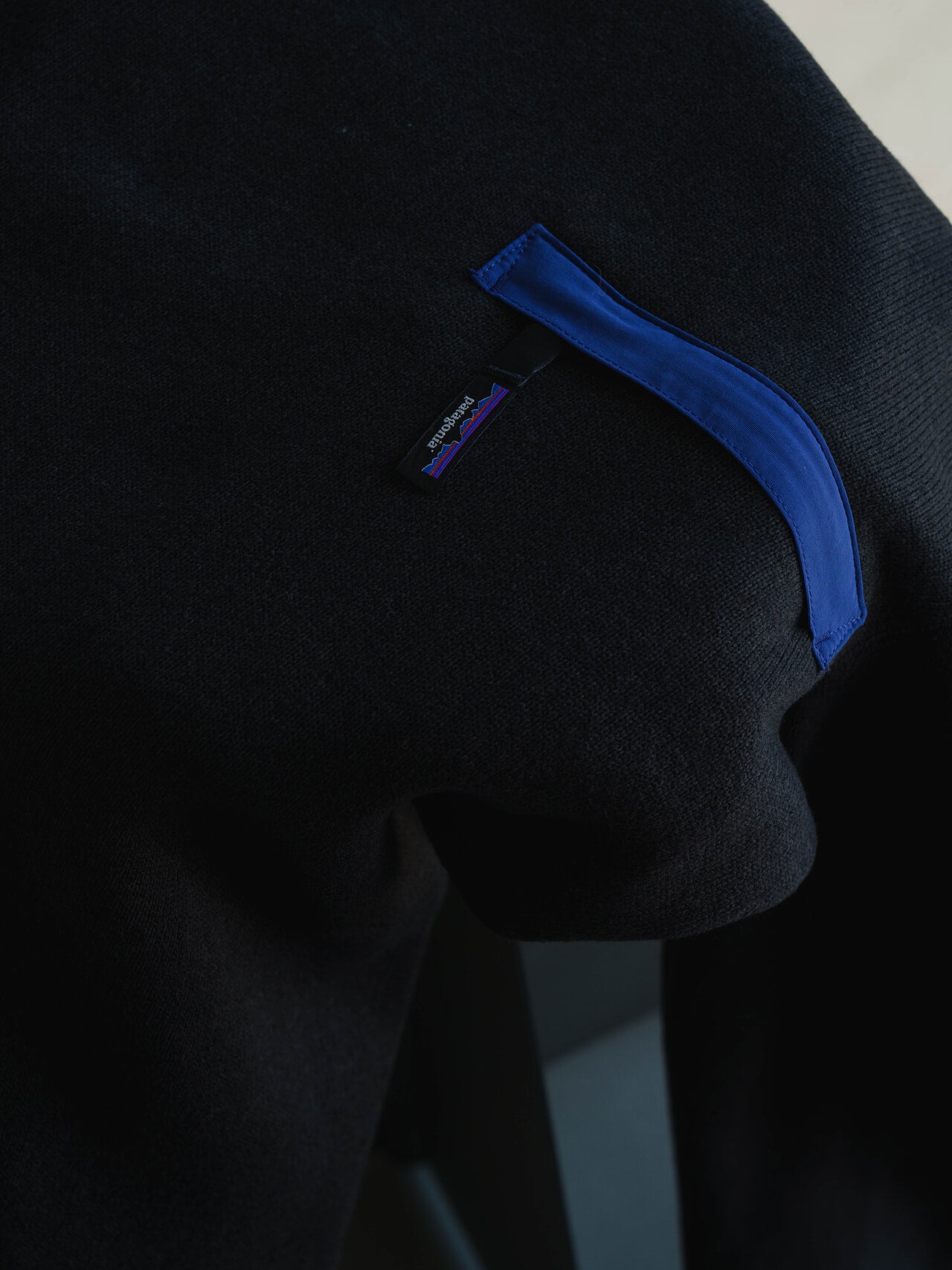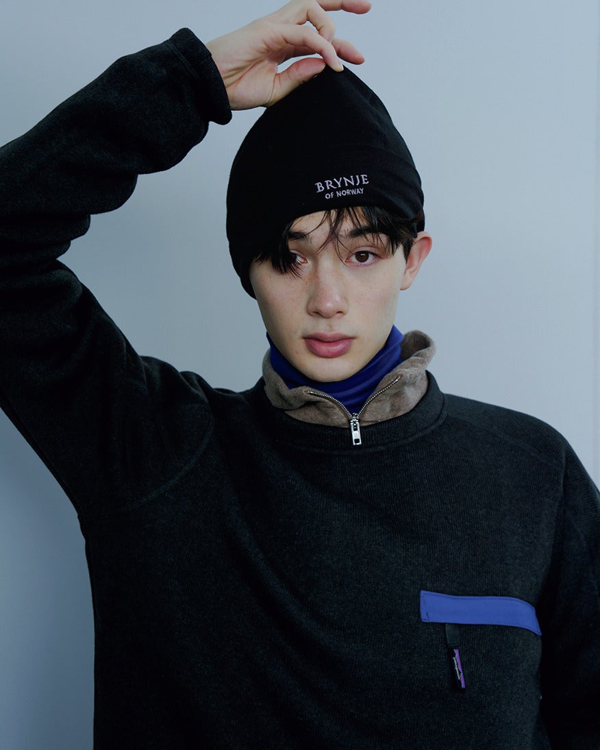 「ソフトな着心地のセーターはミッドレイヤーにおすすめ! メリノウールとナイロンの2層の断熱性能を持つビーニーをかぶって寒い冬を楽しみたい」。