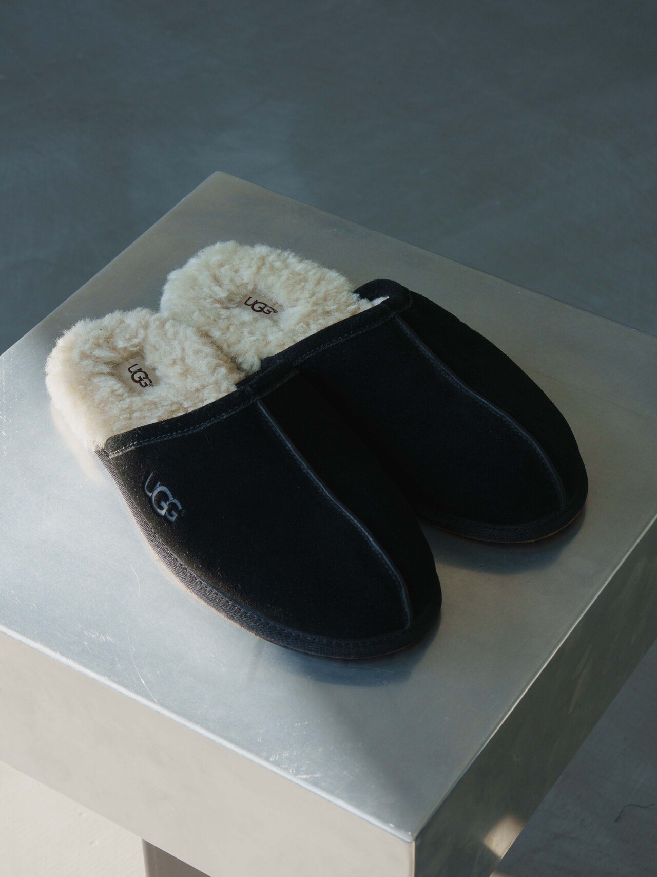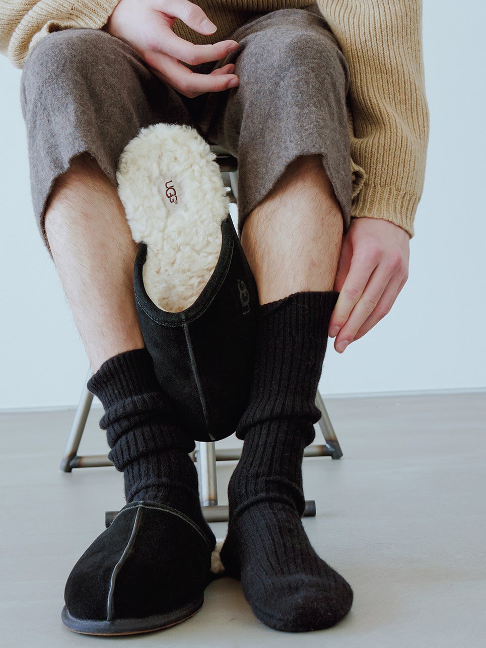 「暖かくて湿気を逃す、温度調節機能を備えたウールのライニングは、室内で過ごす週末や夜の足もとにぴったり」。