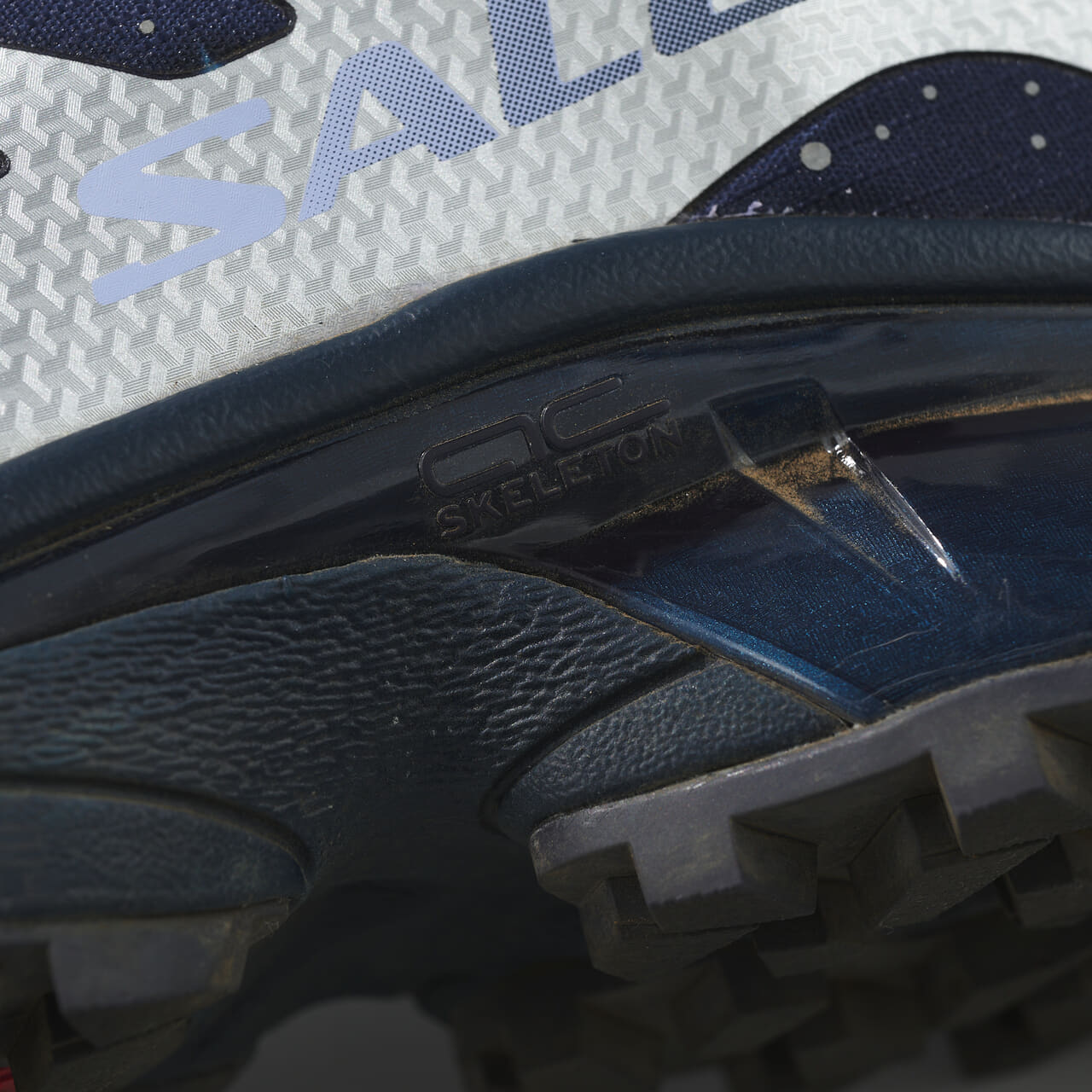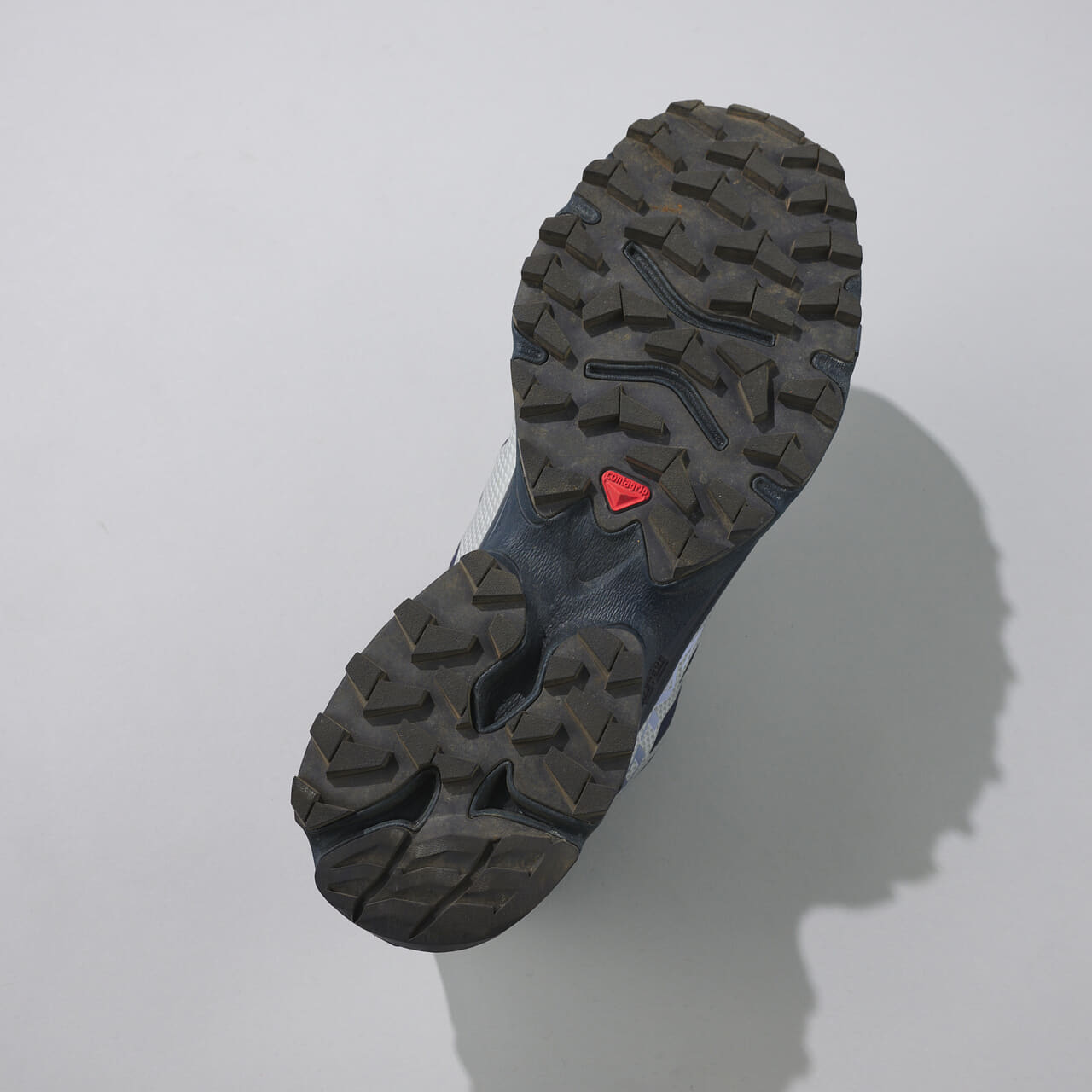 トゥに同系色であしらわれたゴアテックスのロゴやサイドにグラデーションで大胆に配された「サロモン」のロゴも刺さりますね。トレイルランニングモデルということで、高いグリップ力を誇るアウトソールも迫力があってカッコイイです!