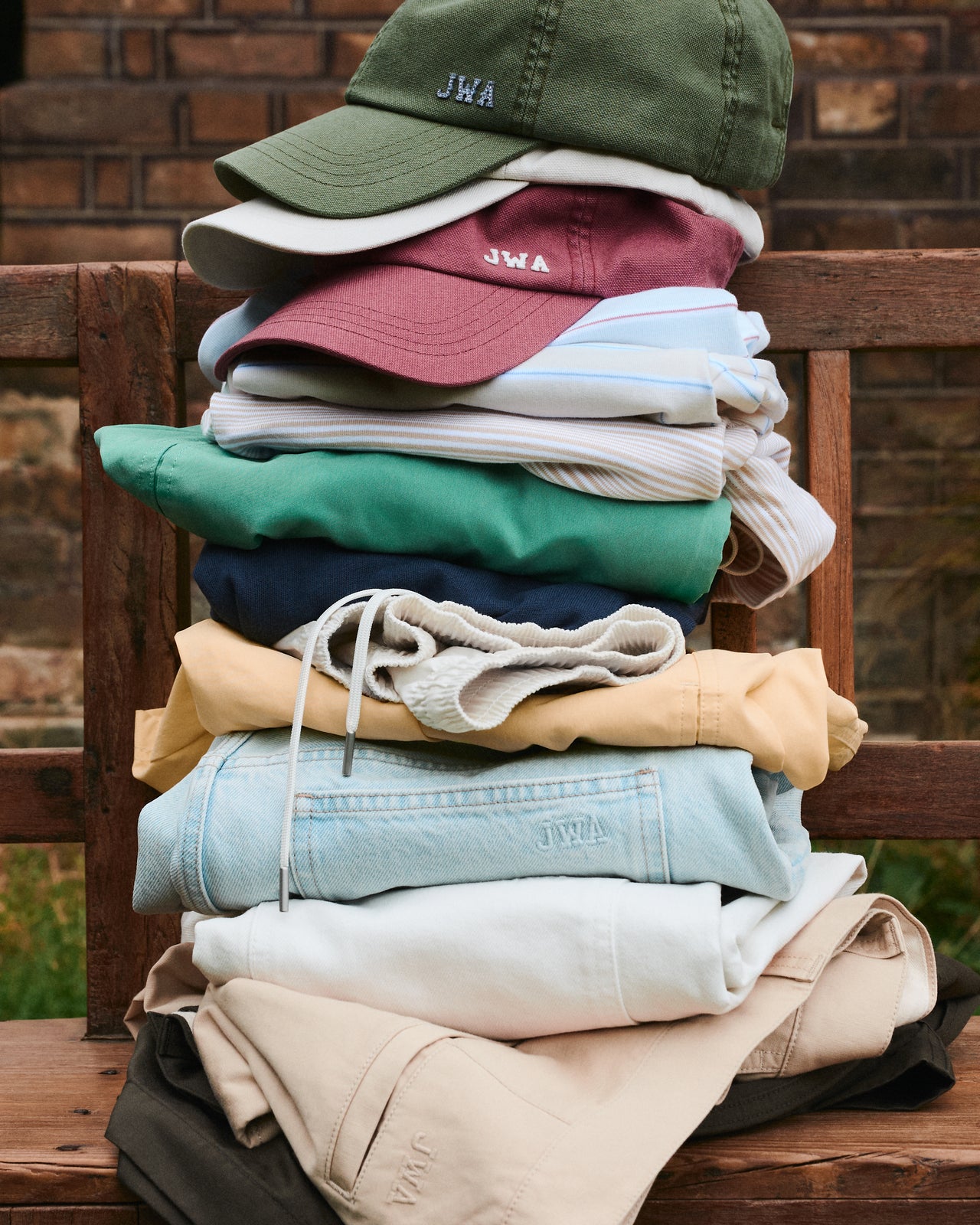 ウィメンズのウィンドプルーフショートパーカは撥水加工が施され、裾のアジャスターでシルエットの調整も可能だ。ウィメンズのバギージーンズには、季節に合ったナチュラルカラーが登場。JWAロゴがアクセントのメンズドライカノコポロは全20色、デザインTシャツは全10色を展開し、スタイリングの幅を広げられるラインナップに。