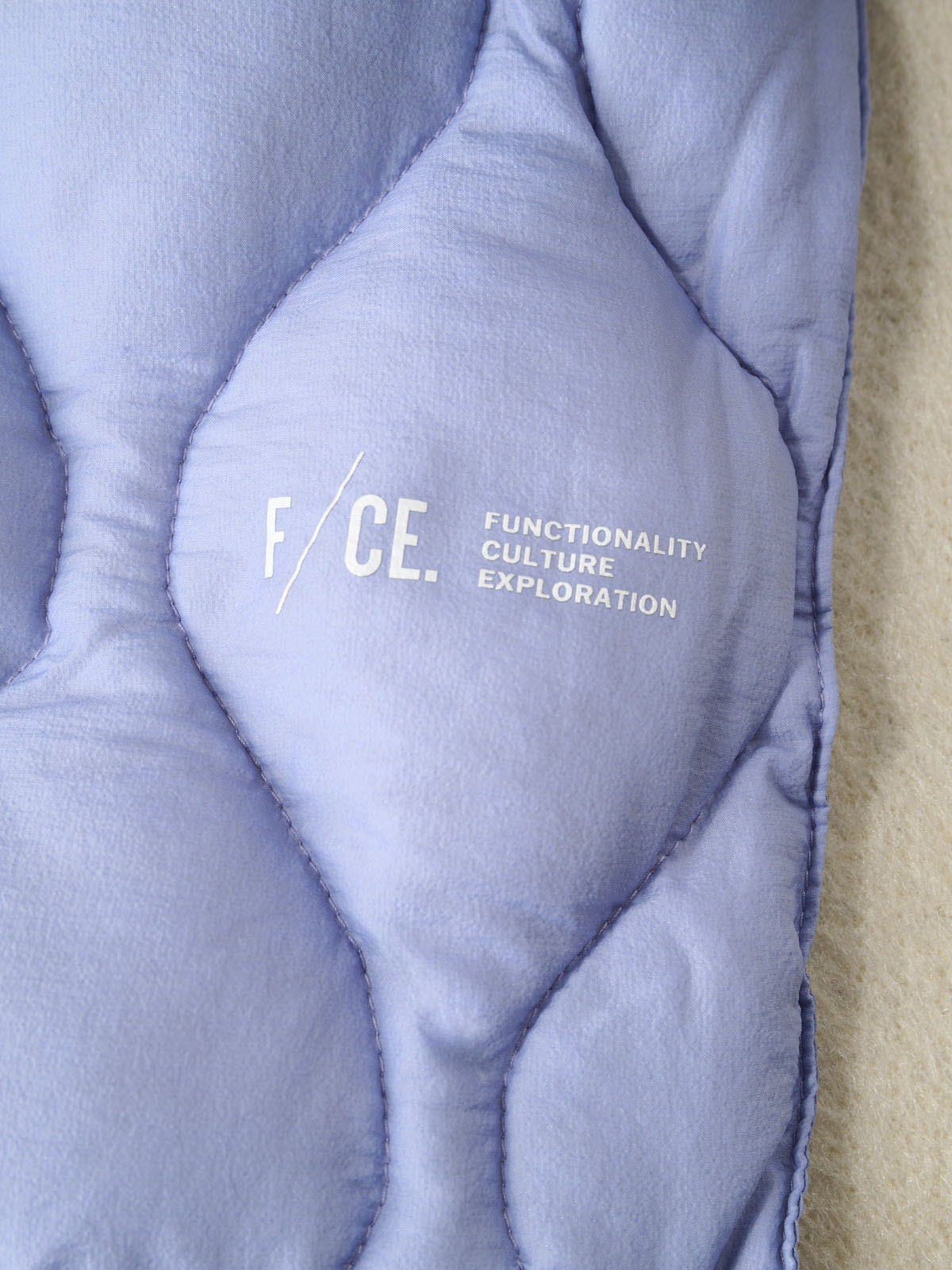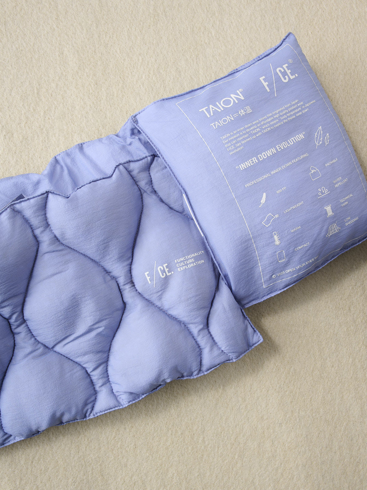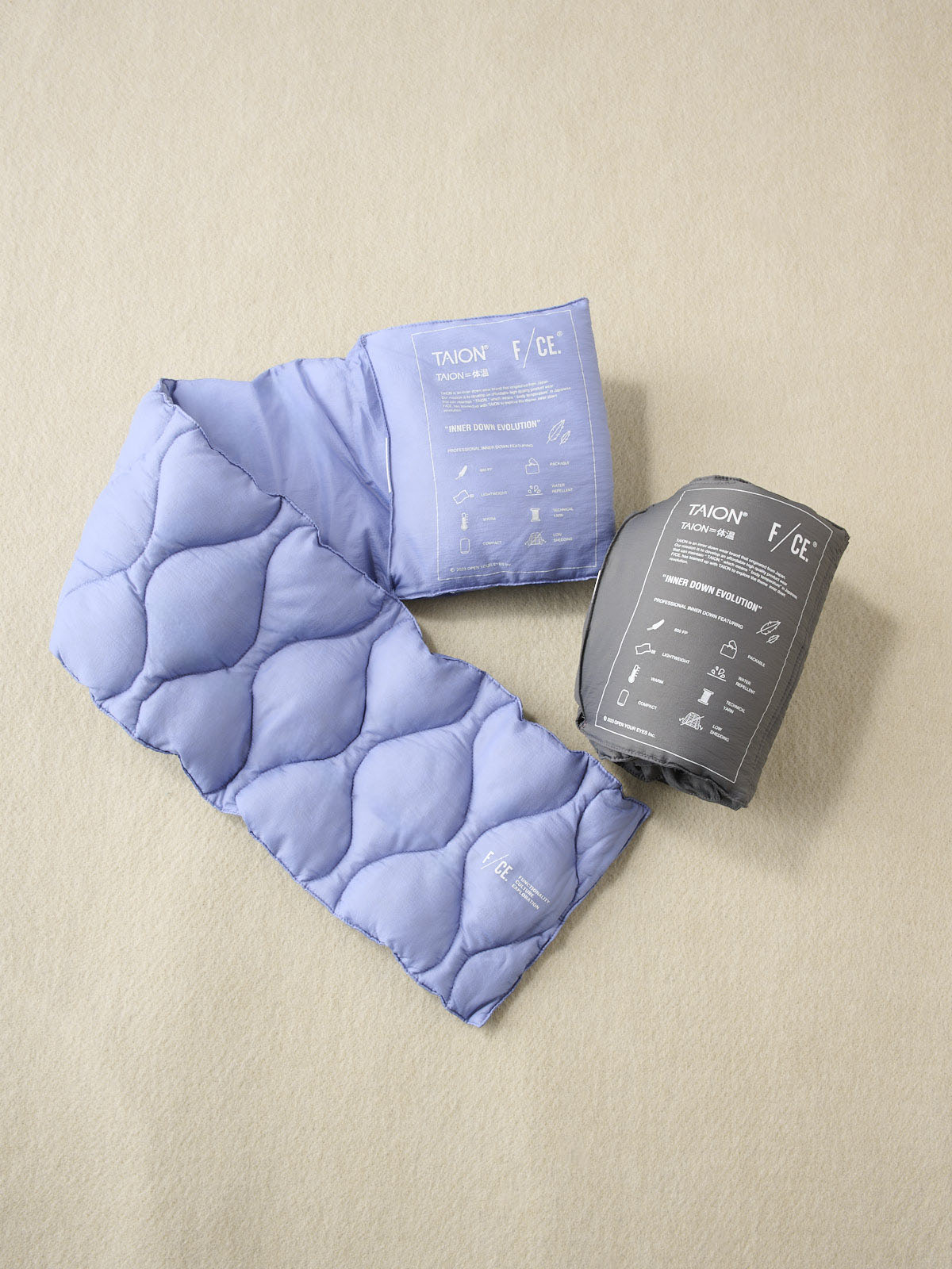 インナーダウン専業ブランド、TAIONとF/CE.のコラボレーションによるダウンマフラー。800FPの高品質なホワイトダックダウンを使用。表地は軽量かつ強靭なリップストップ素材で撥水機能もついているのがうれしい。パッカブル仕様のアイテムでさりげなく暖かい格好をするのがスマート。