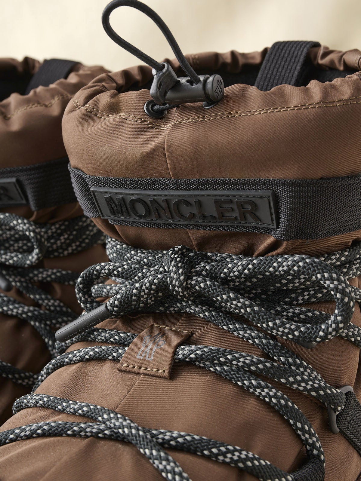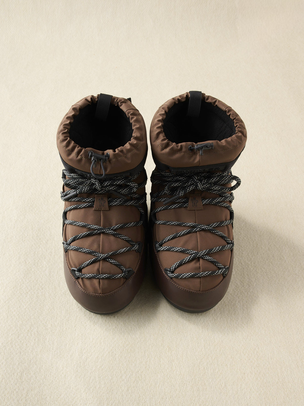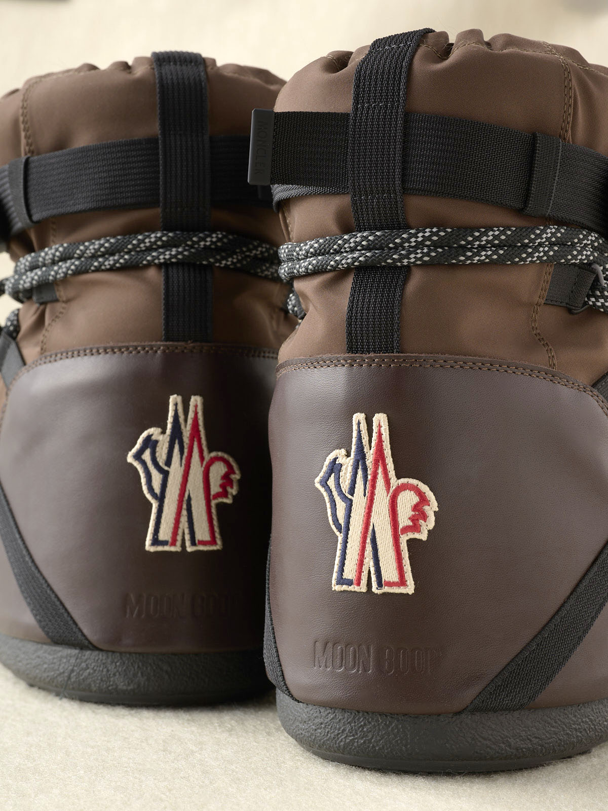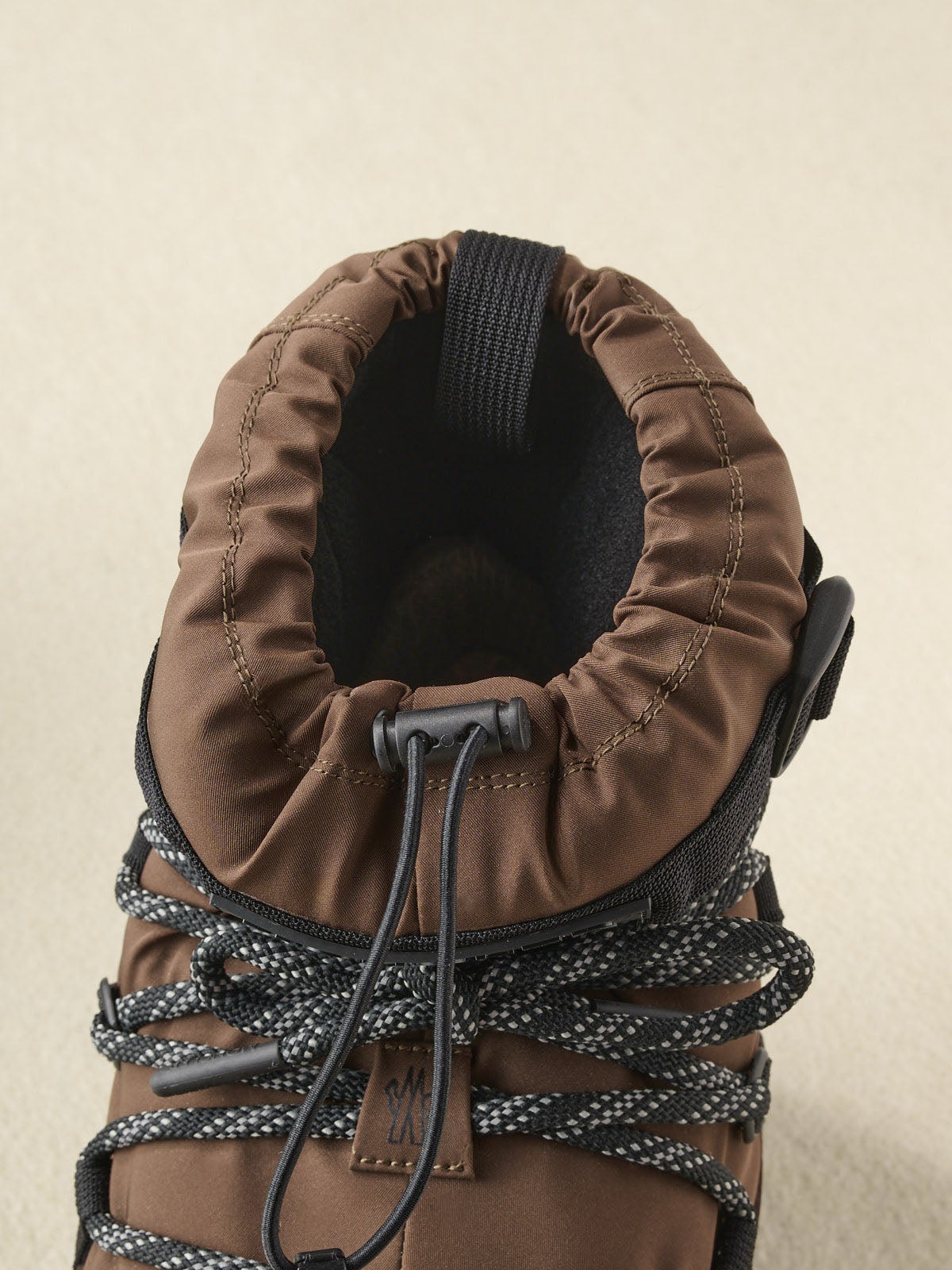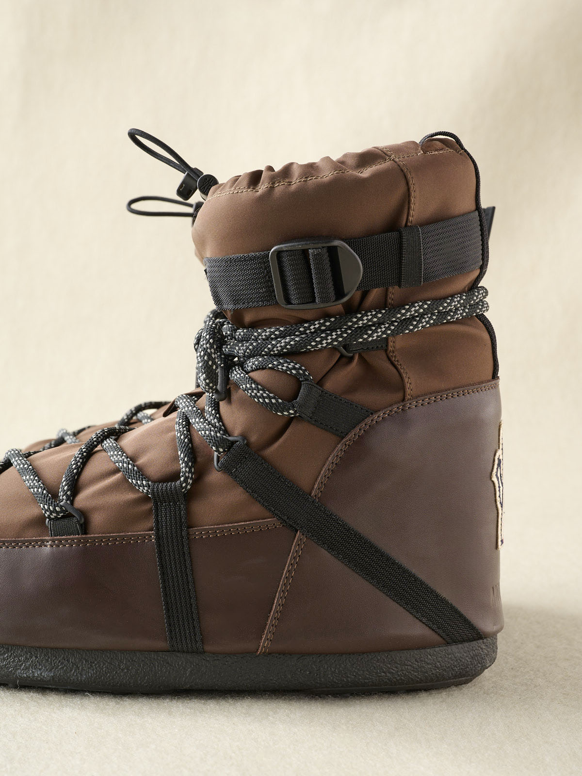 スノーボードブーツのような1足を楽しめるのも寒い日の特権。アッパーはナイロン素材をベースに、ナッパレザーのアクセントがきいているから、遊び心のあるフォルムでありつつも、上品で大人なブーツに。ブラウンとブラックの配色もいい。