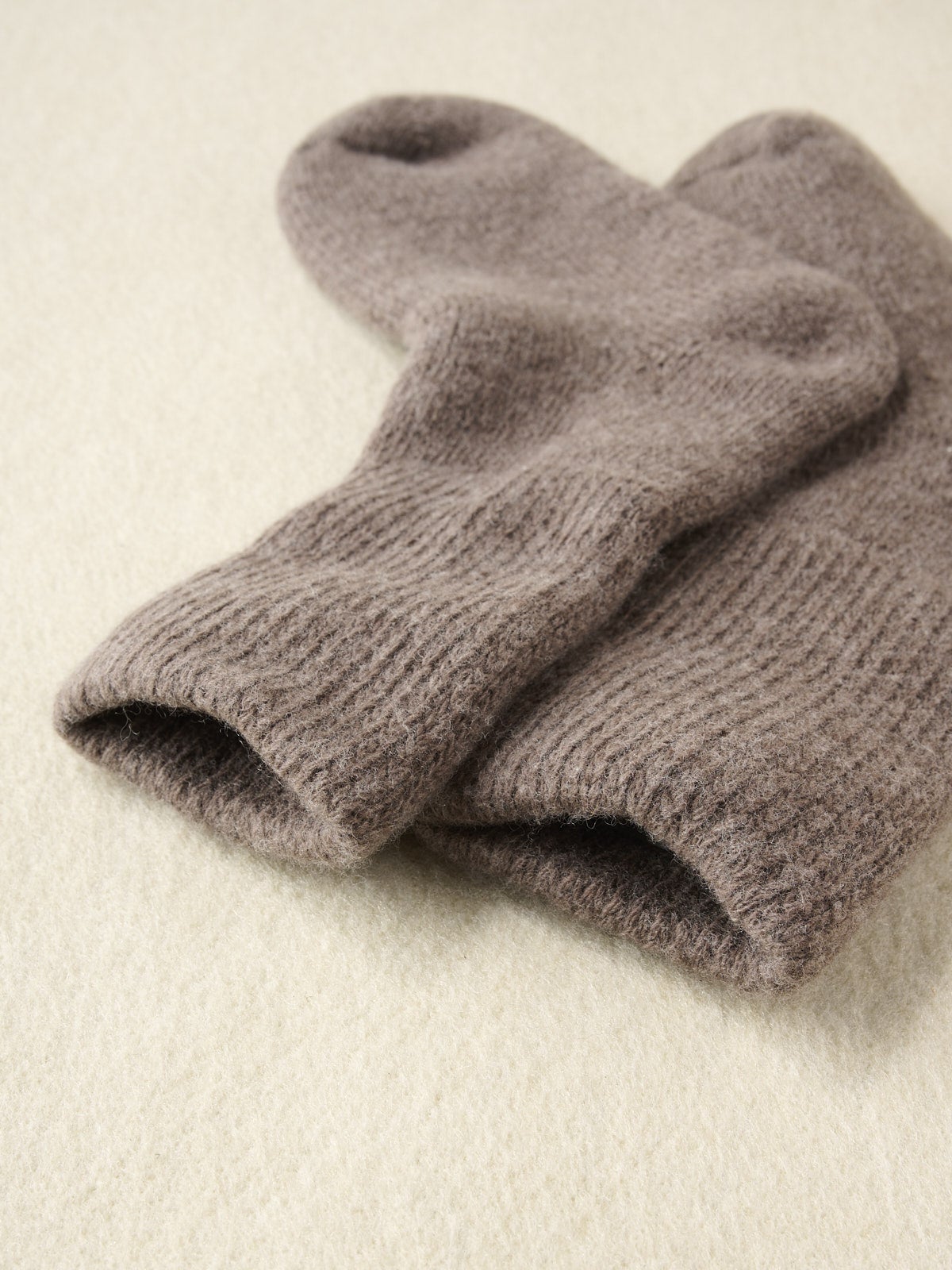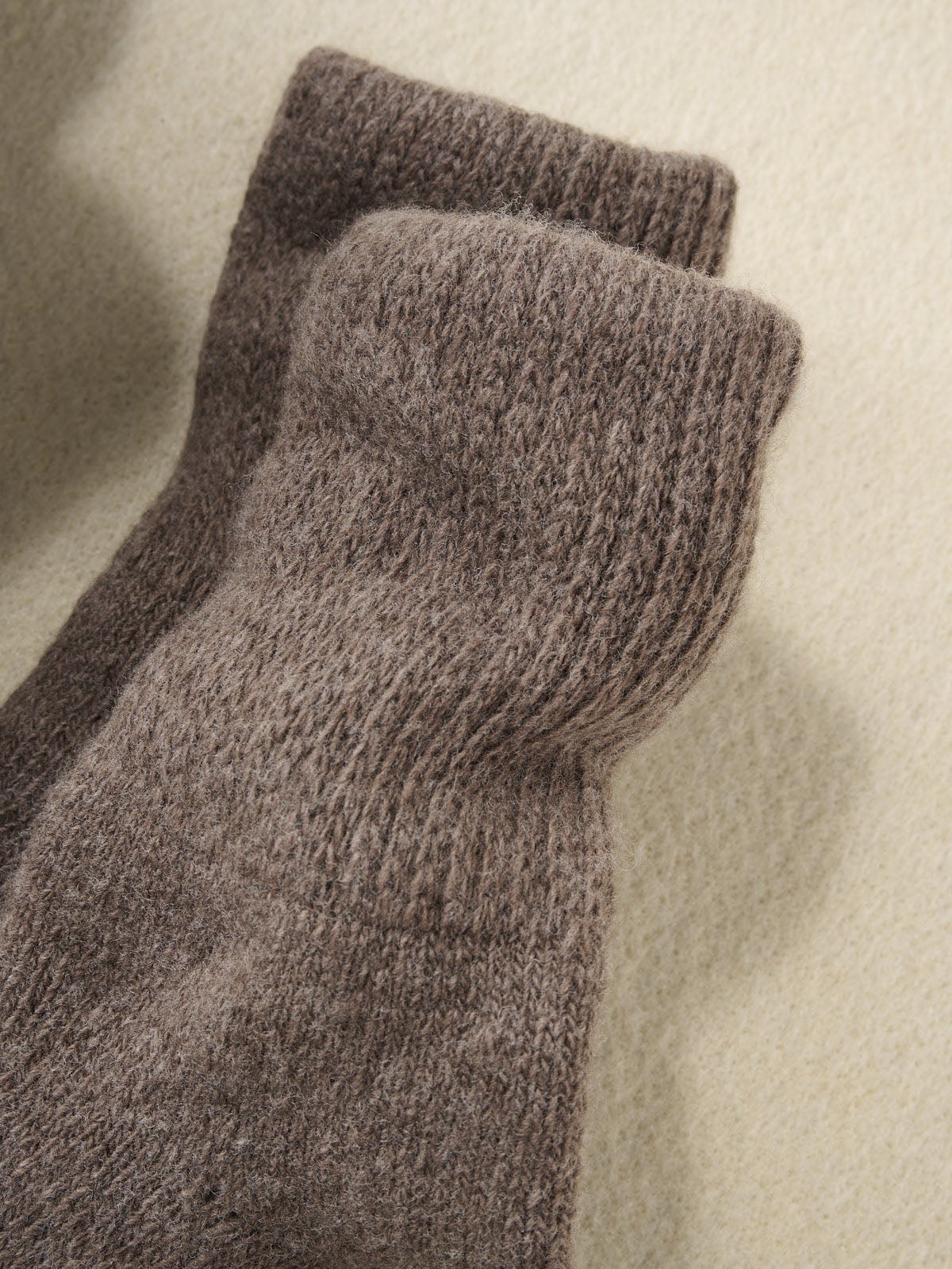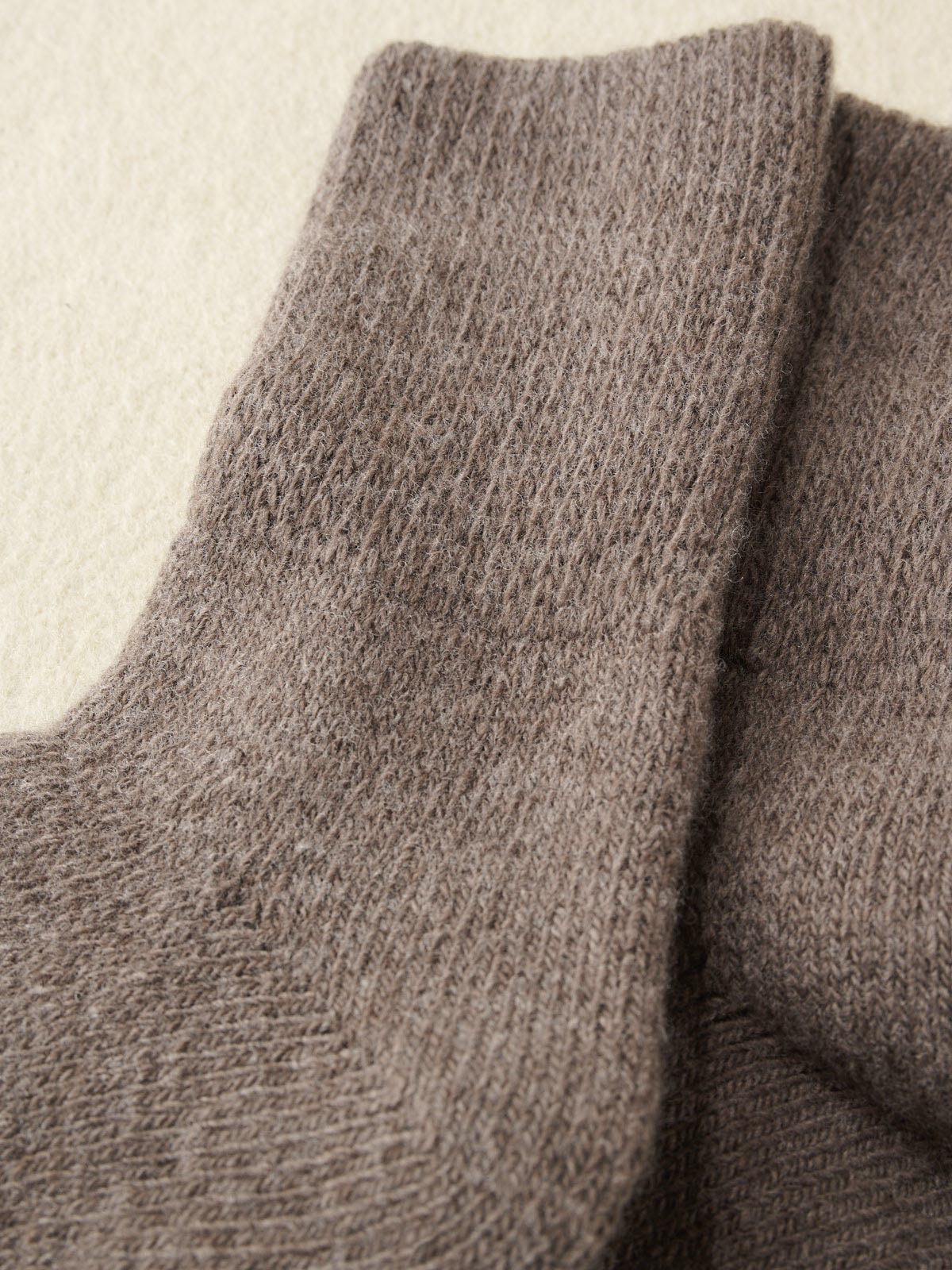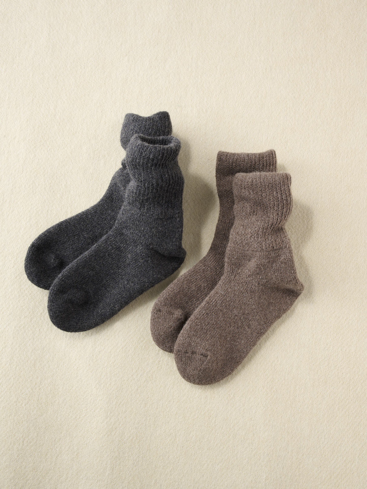 ウール素材を使用し、パイル編みにすることで、見た目以上に保温性が高いソックス。かかとの形状に合わせて作られているから、かかとにしっかりフィットし、ずれにくいのが特徴。履き口にゴムを入れず、締め付け感を軽減しているのもポイント。