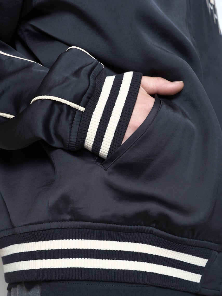 程よい光沢でヴィンテージ感のあるサテン素材を使用したリブブルゾン。全体的に落ち着いた色合いと随所のディテールがレトロモダンなスタイルを演出。ブラック、ベージュ、ダークグリーンの3色展開。