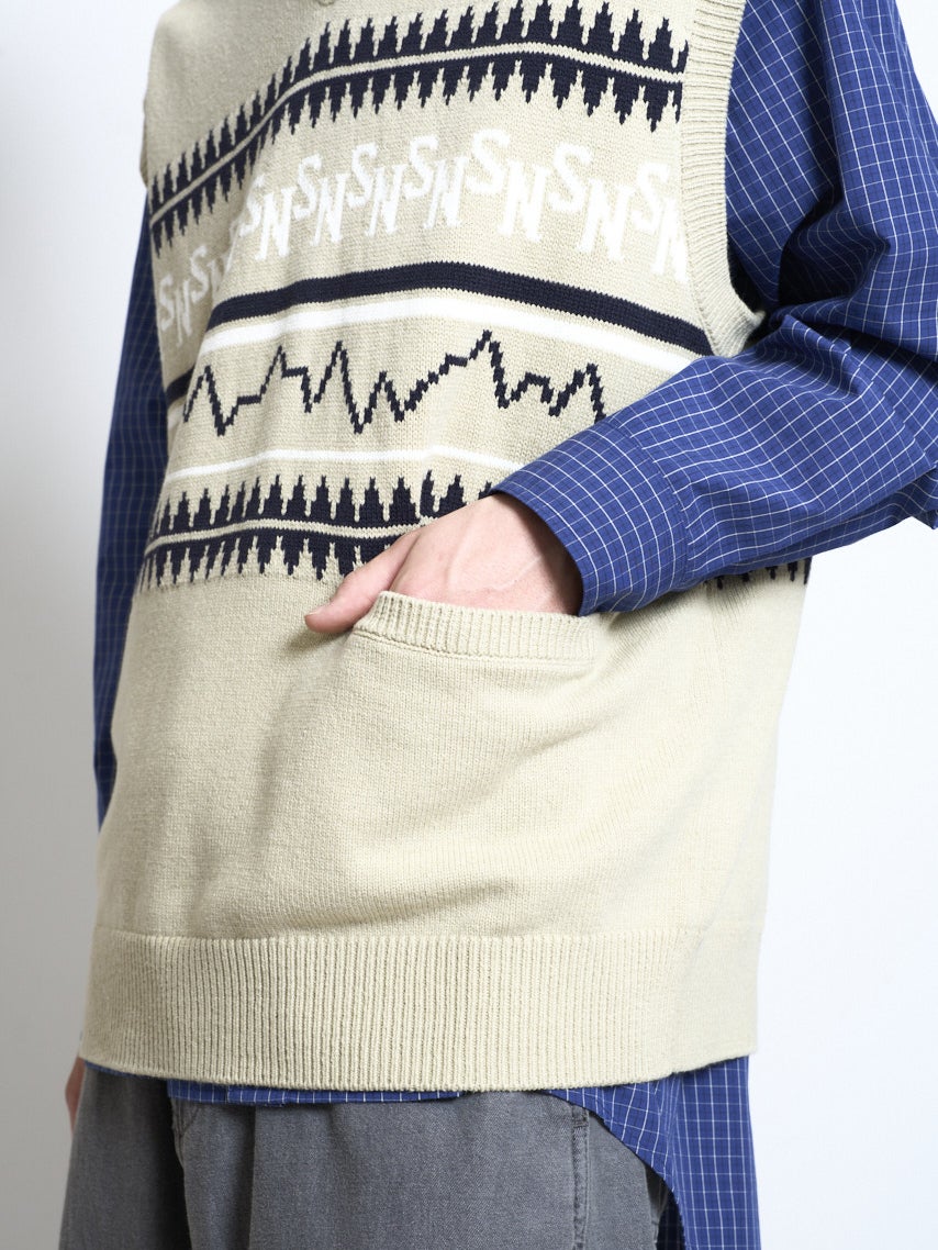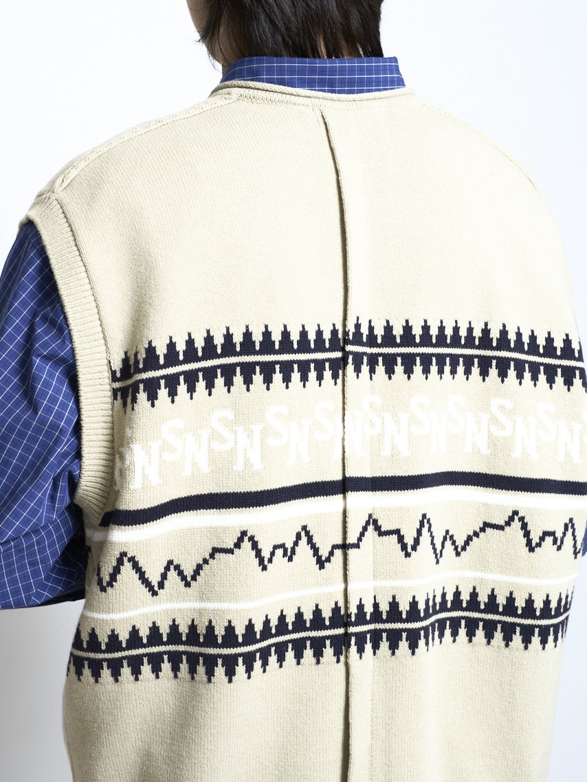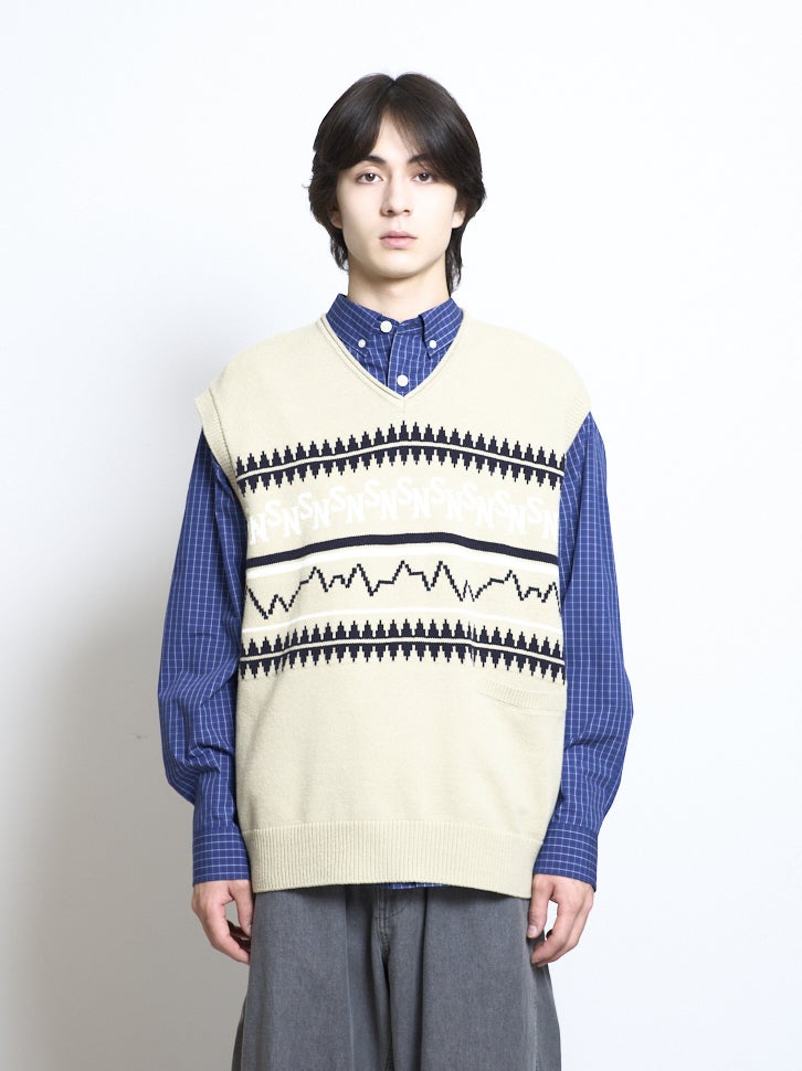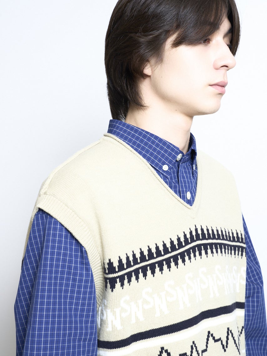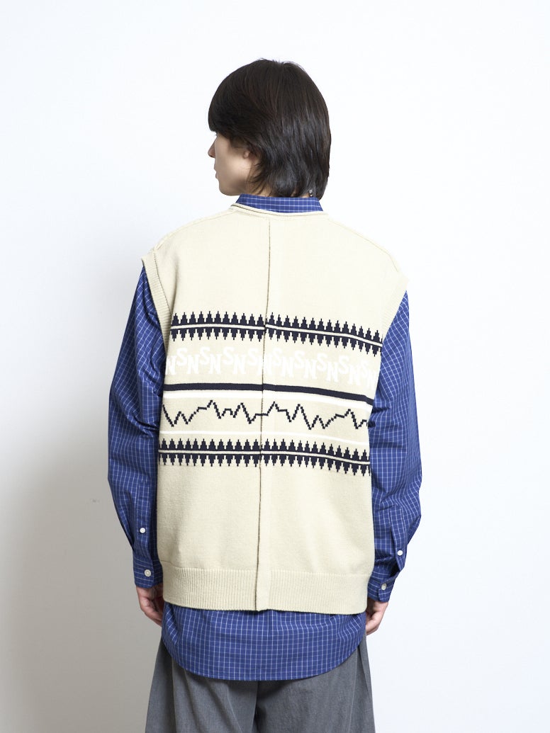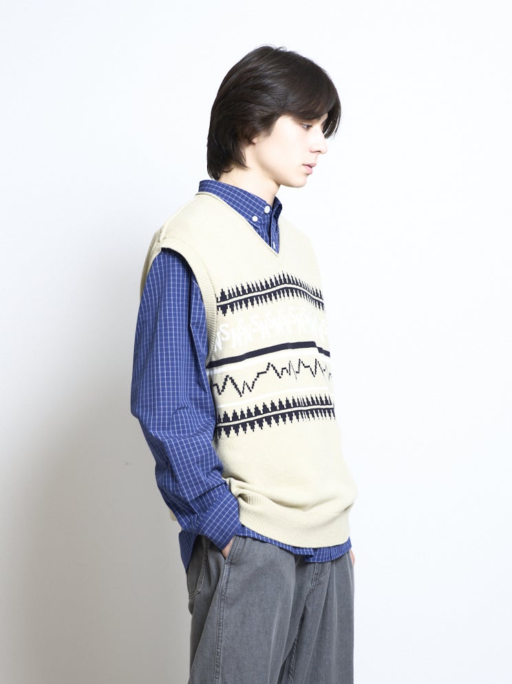 コレクションコンセプト”Silent/Noise”をモチーフにしたパネルデザインをジャカード編みで表現したVネックベスト。