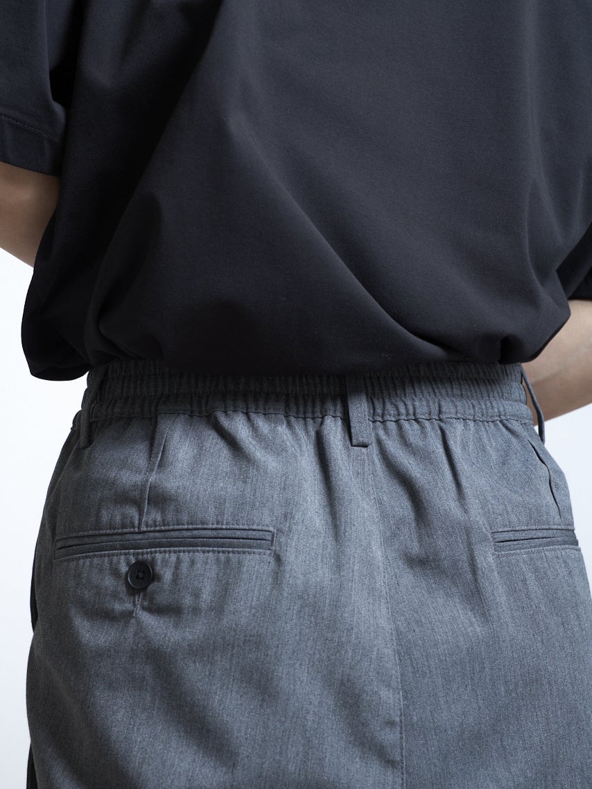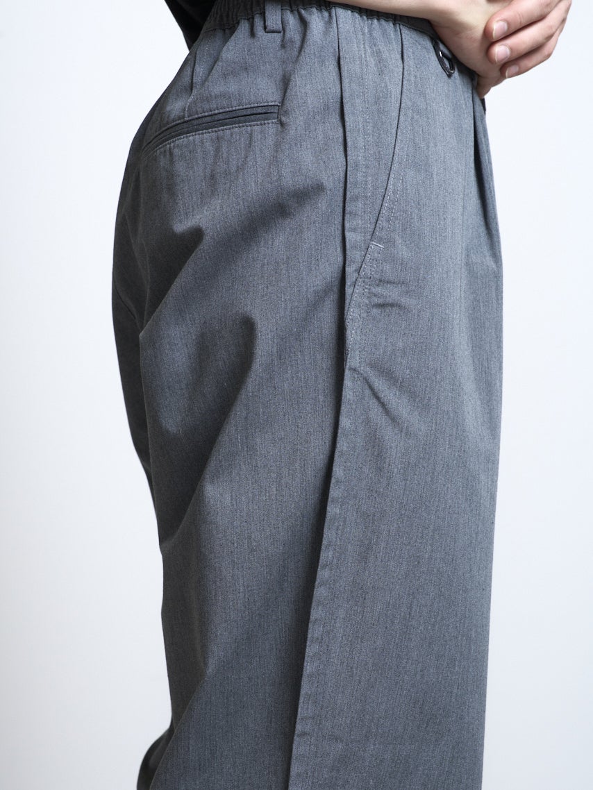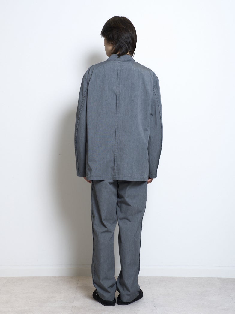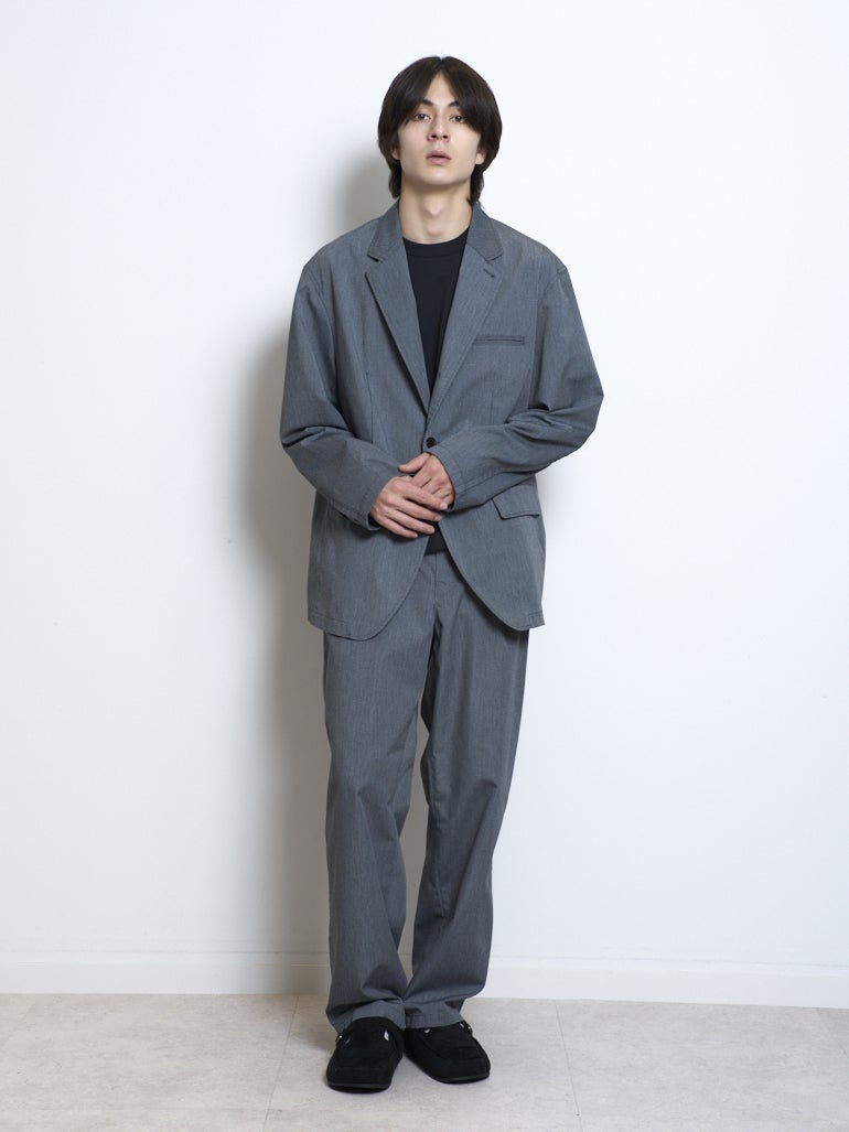 ポリエステルとコットンの混紡素材を使用し製品洗いを施した、1枚仕立てのジャケットと、ワイドテーパードパンツ。グレーとブラックの2色展開。
