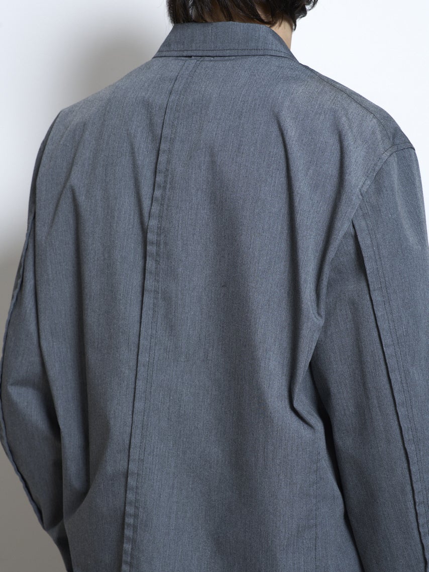 ジャケットは本コレクションの象徴的な縫い代を表に出したインサイドアウトデザインに。1枚仕立てで製品洗いを施しカジュアルな羽織りとして長く着用できる。