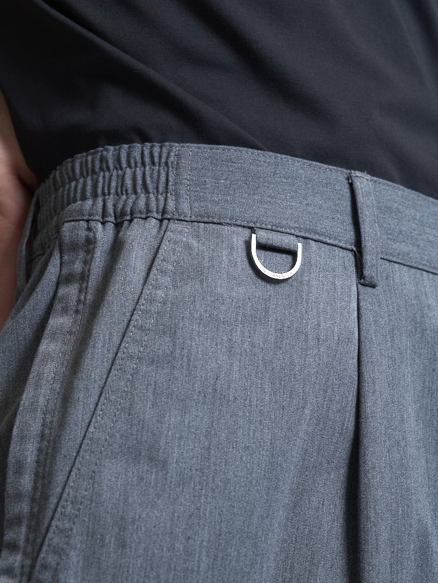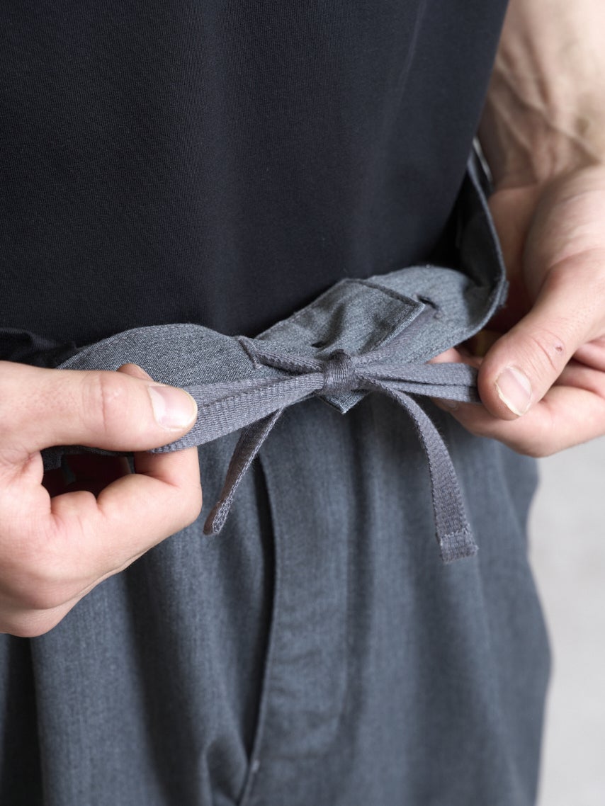 パンツは腰まわりのゆとりから裾にかけてテーパードされたシルエット。ウエストはサイズ調整しやすいベルトループつきの半ゴム仕様になっている。