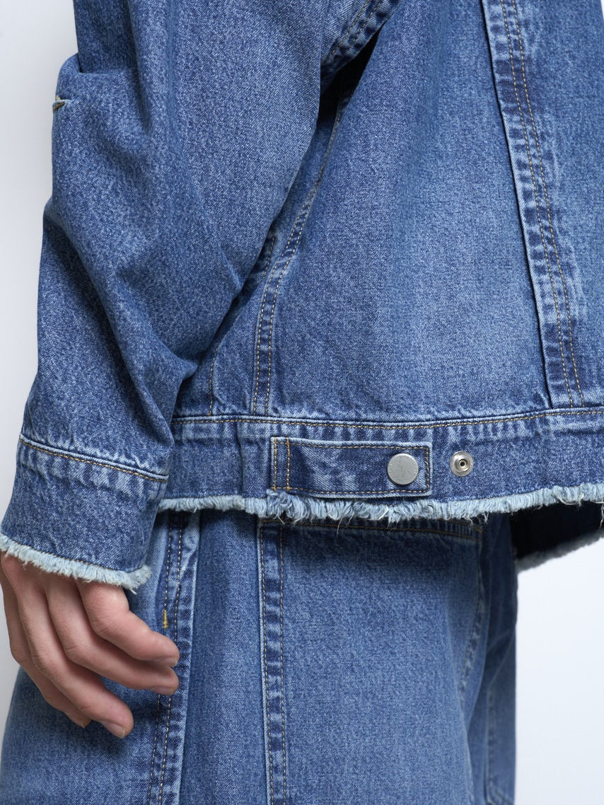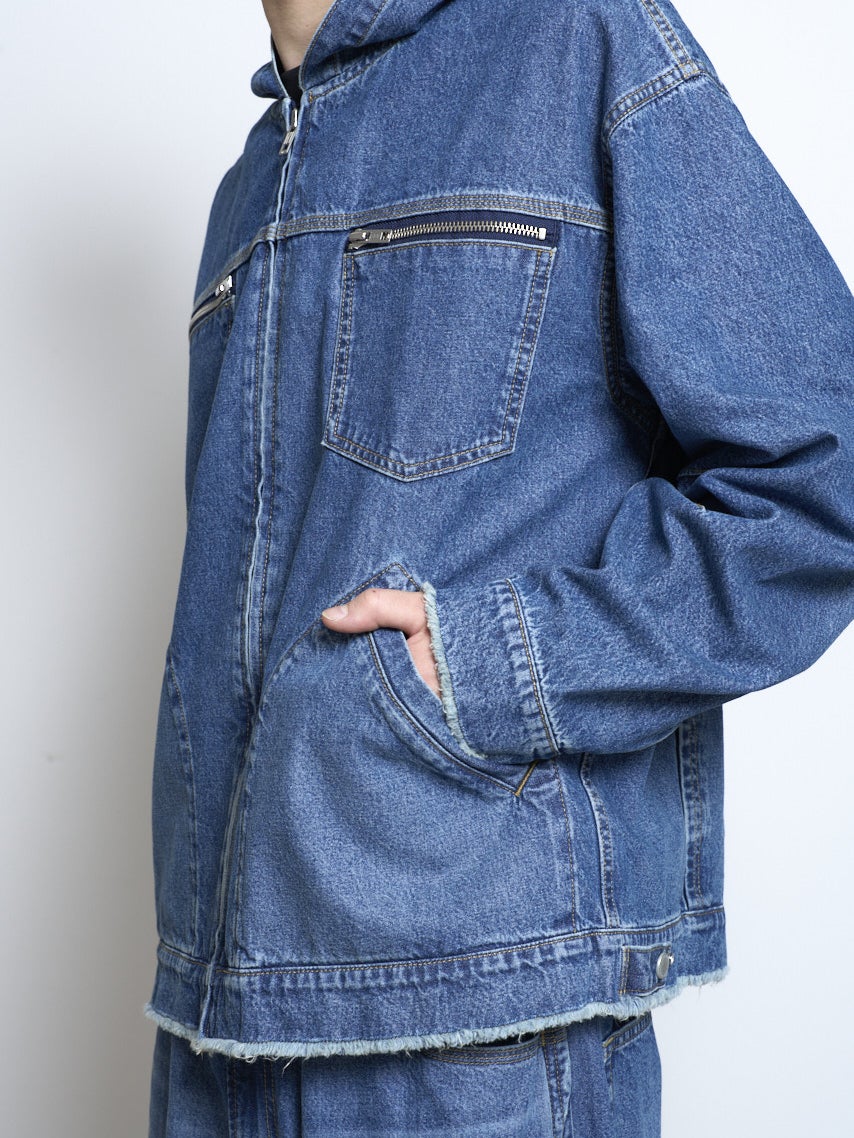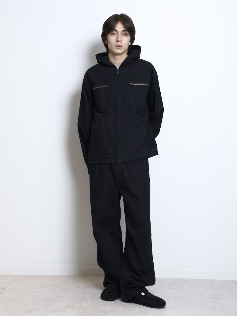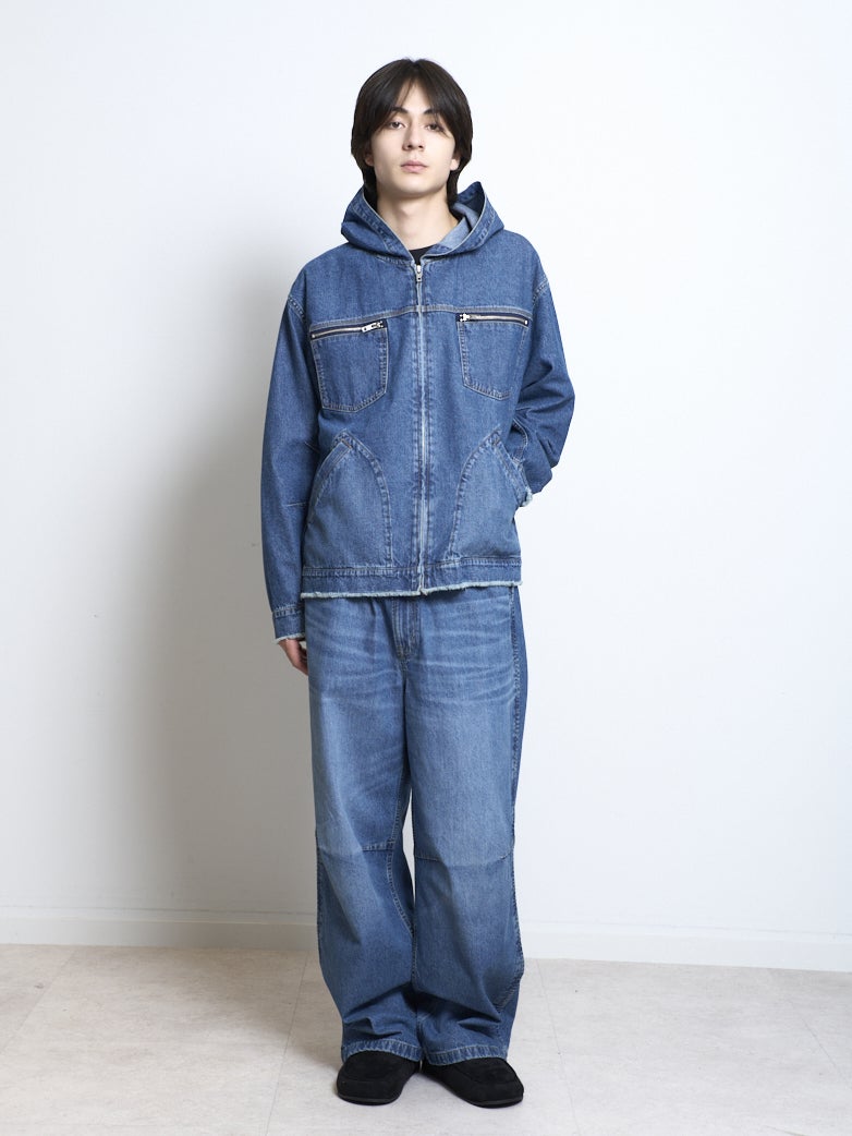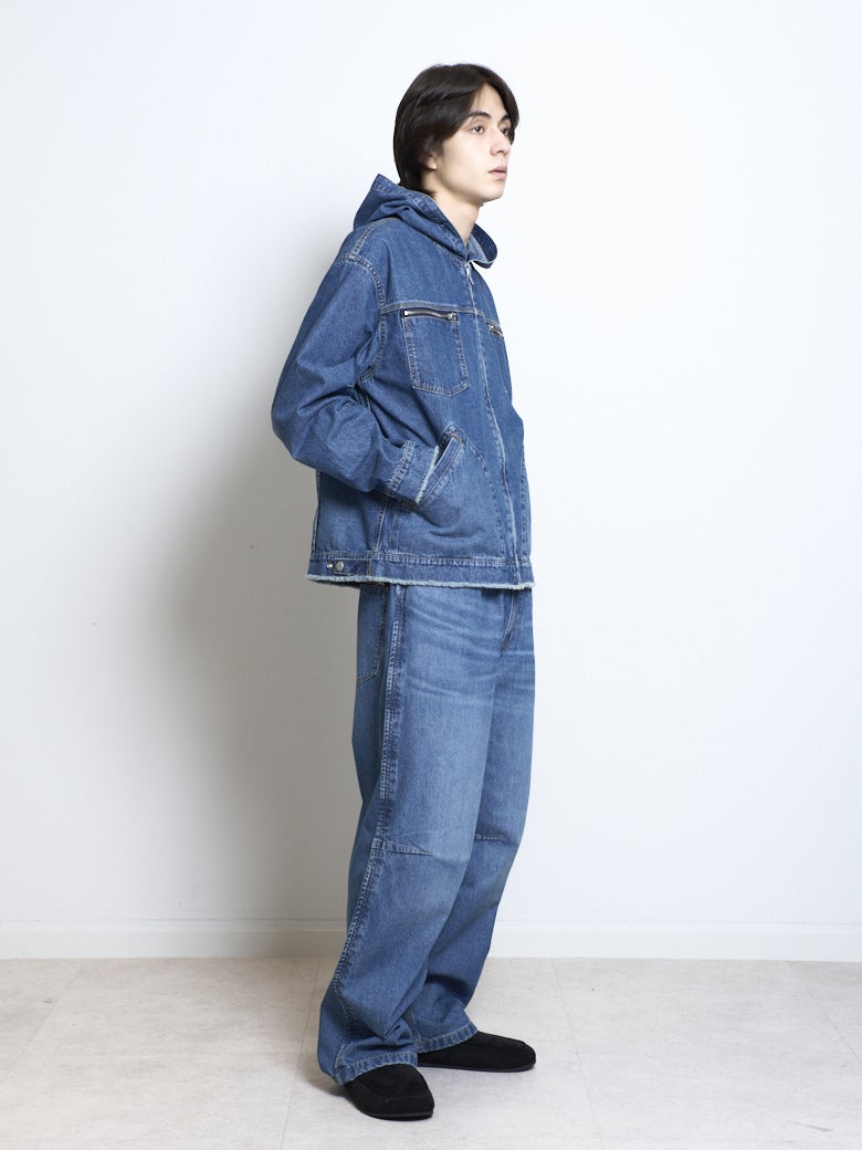 9.75オンスのデニムを使用したフードつきのブルゾンとデニムイージーパンツ。