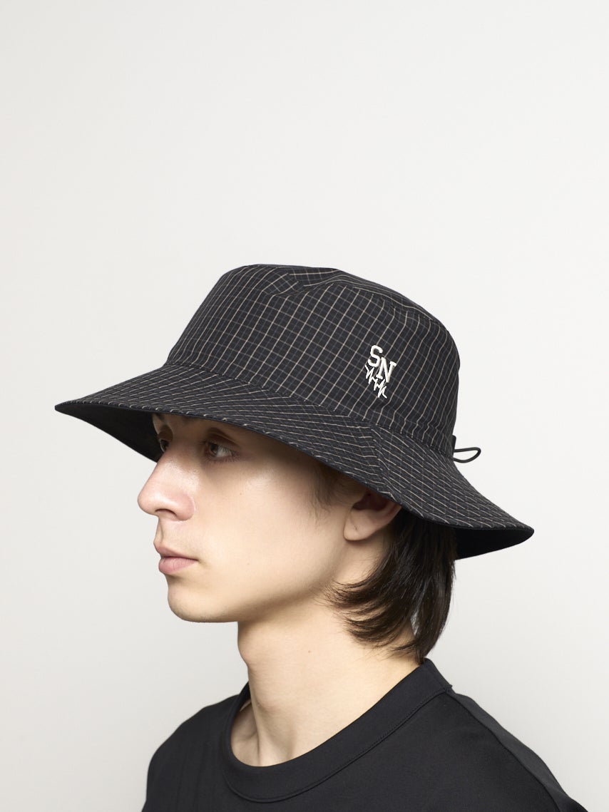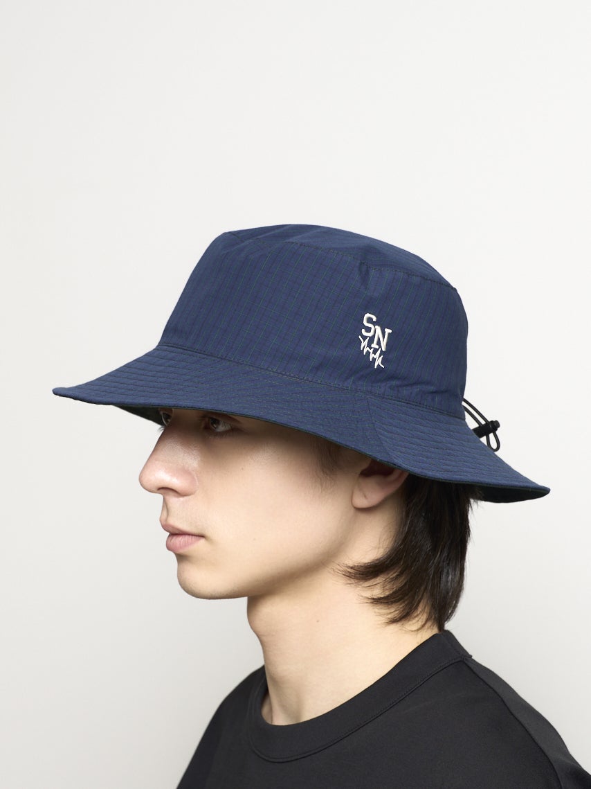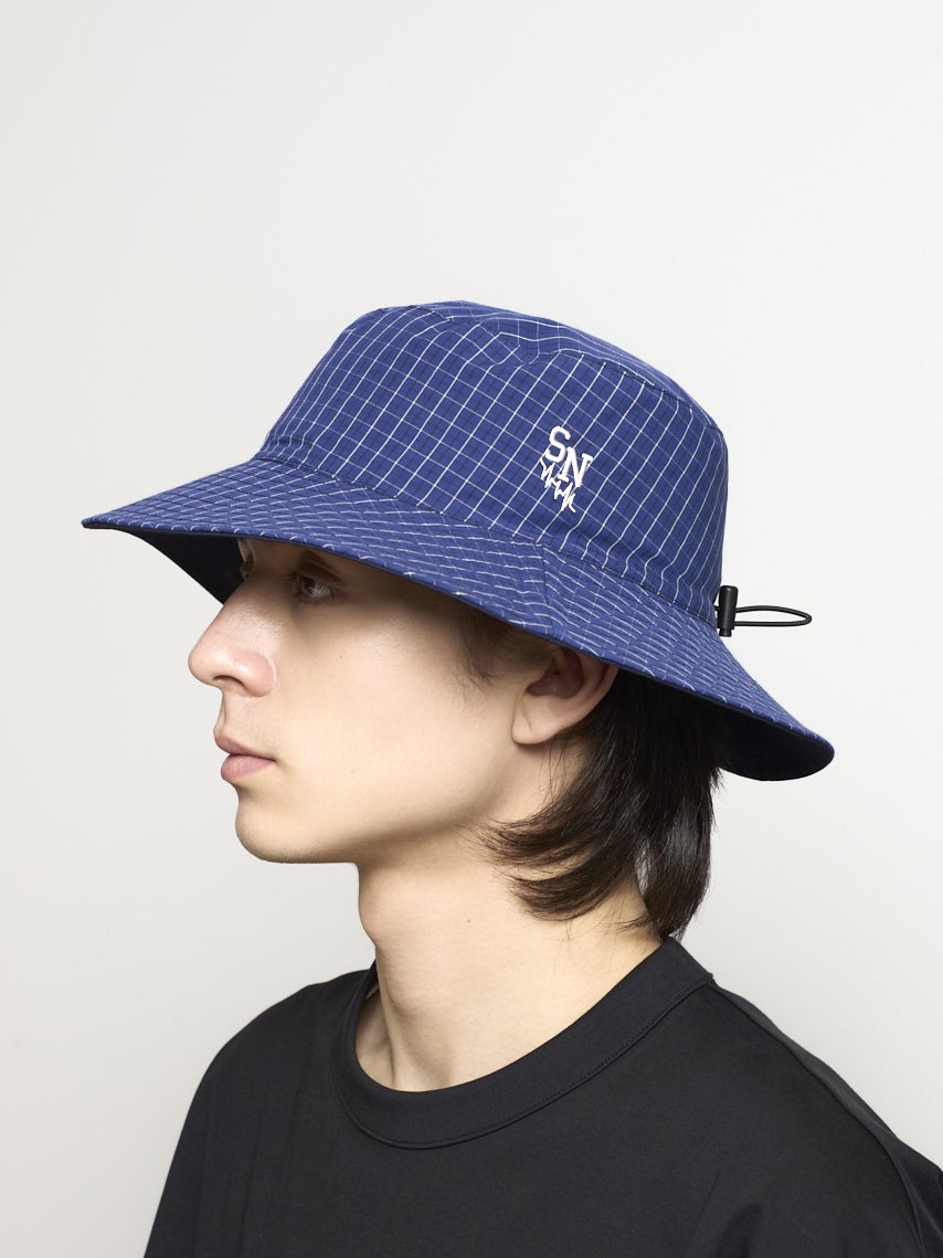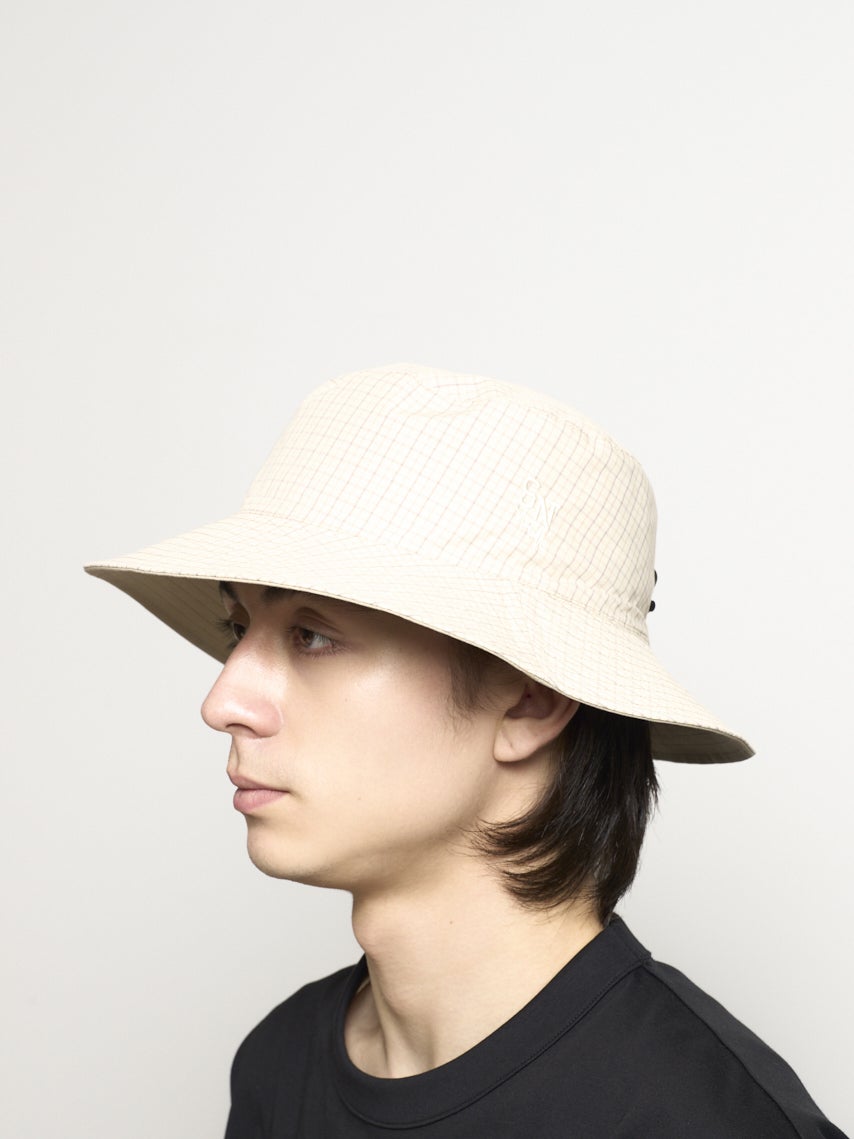 リバーシブルで着用できるバケットハット。それぞれ表が無地で裏がチェック柄になっている。
