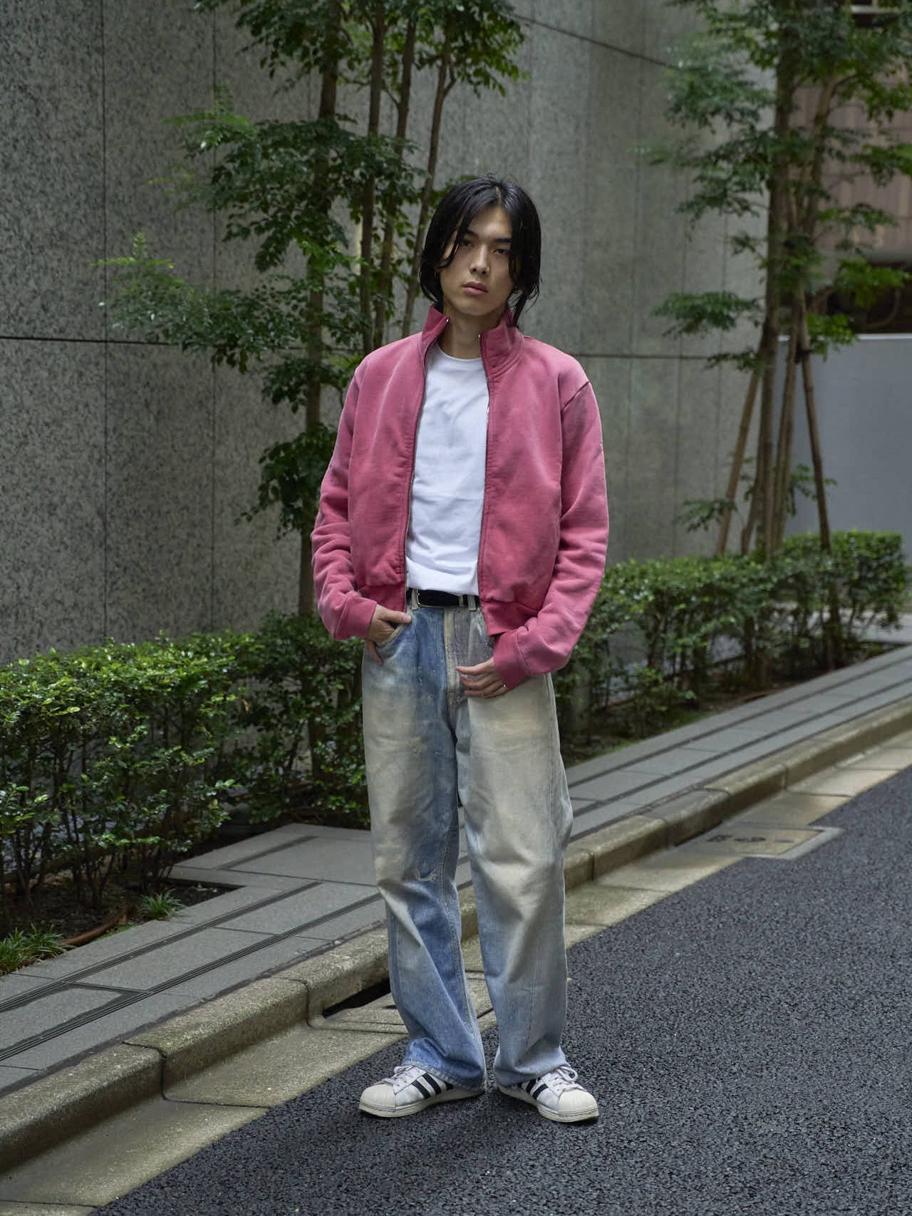 「今シーズンは赤やピンクのアイテムを取り入れていきたいと思っているので、アワーレガシーのパーカをメインにジーンズとスニーカーをセレクト。カジュアルだけど軽やかさもあるスタイリングにしてみました」。