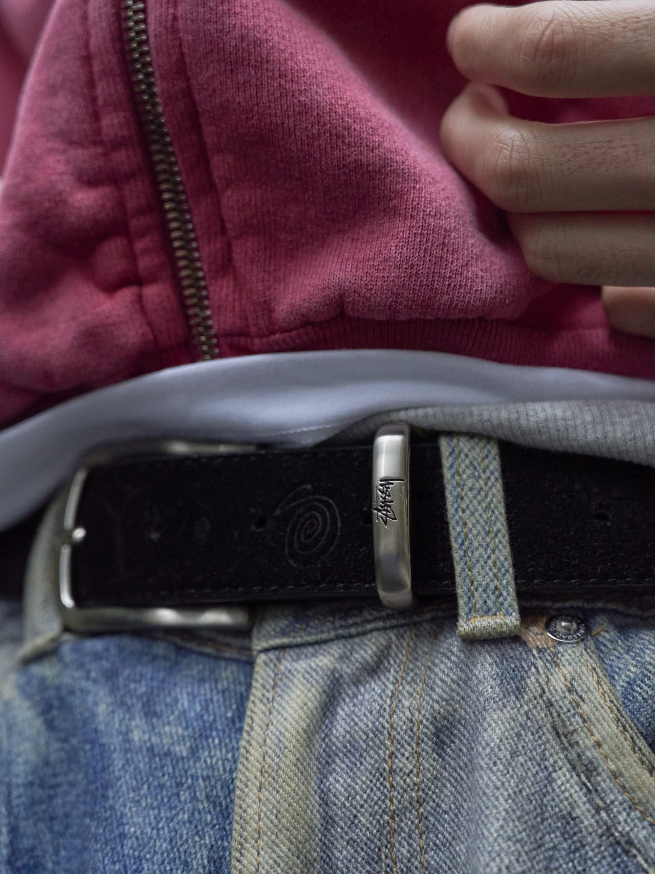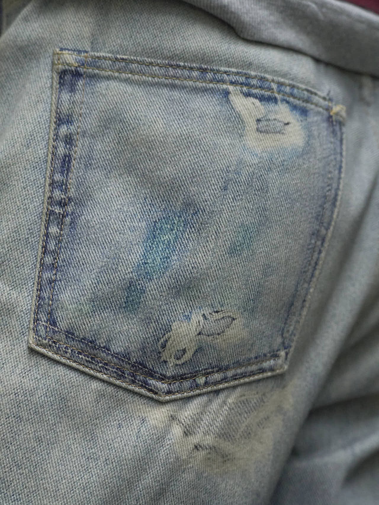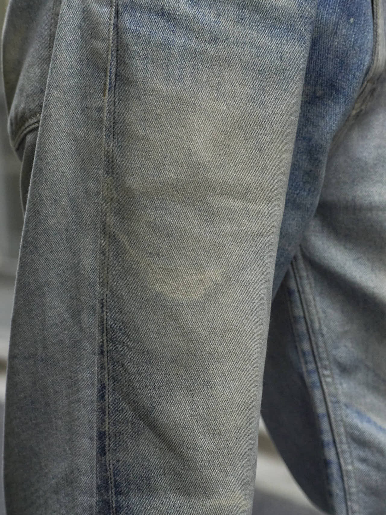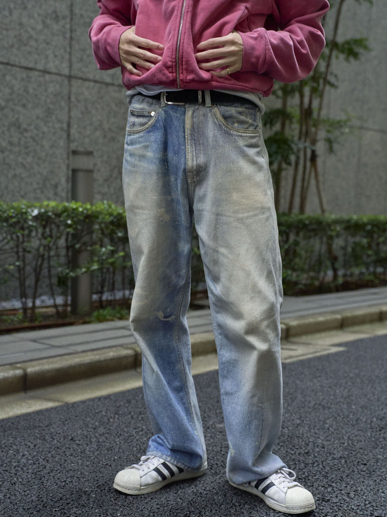 「加工のきいたジーンズでスタイリングに無骨さを加えたのもポイント」。