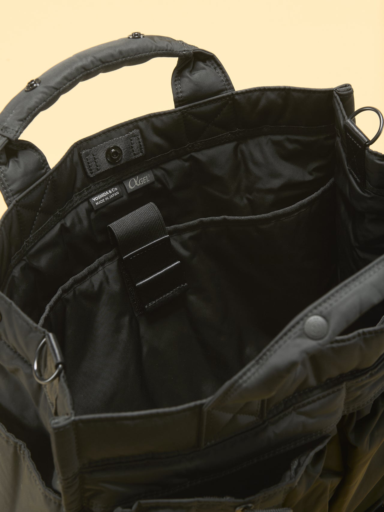 13インチのPCや雑誌などが入るサイズのトートバッグ。マチ幅を広く設計されているため、物を入れても美しい形を保ってくれる。メイン収納部の開口部はホックで開閉する仕様で、荷物の出し入れが簡単。「αGEL(アルファゲル)」を内蔵したハンドルは握りやすく、重さを感じにくいのも特徴だ。