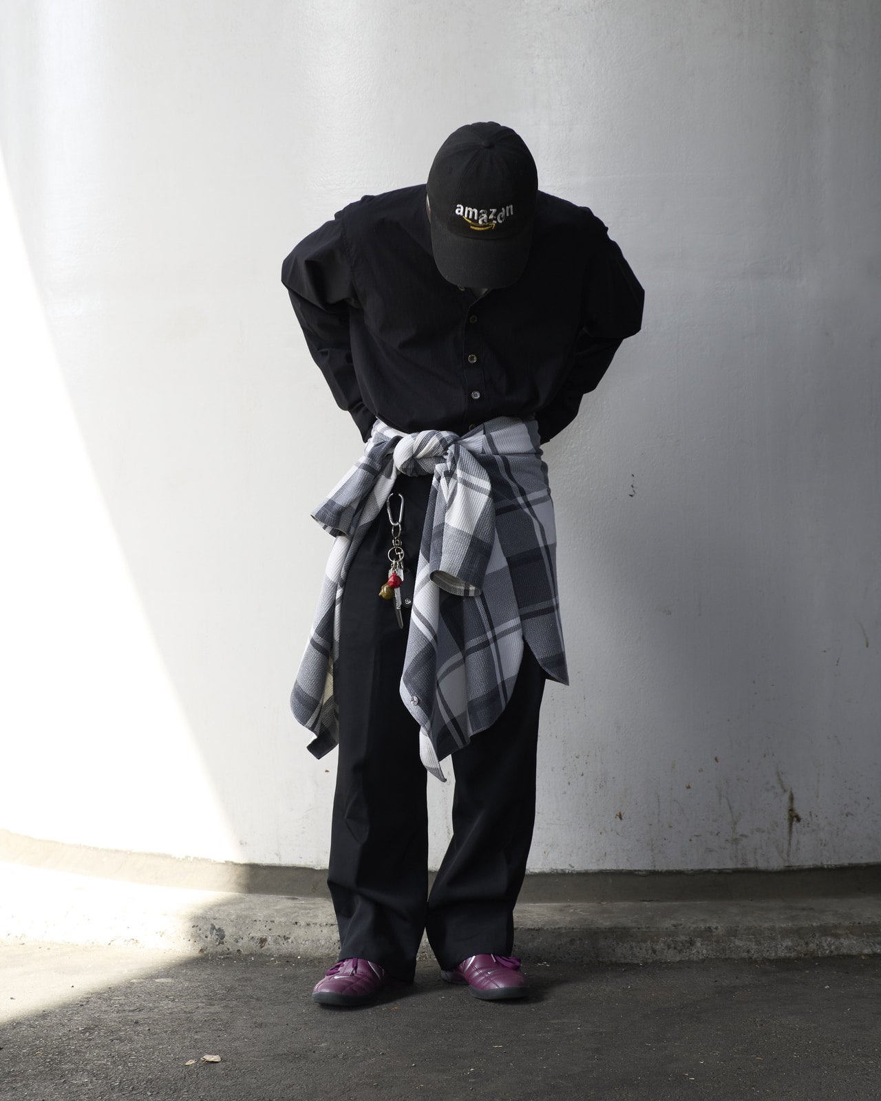 「スニーカーが主役になるよう全体をモノトーンにまとめつつ、トップスとパンツはシャツとスラックスでキレイめなアイテムを選びカジュアルになりすぎないようにコーディネートを組みました」。