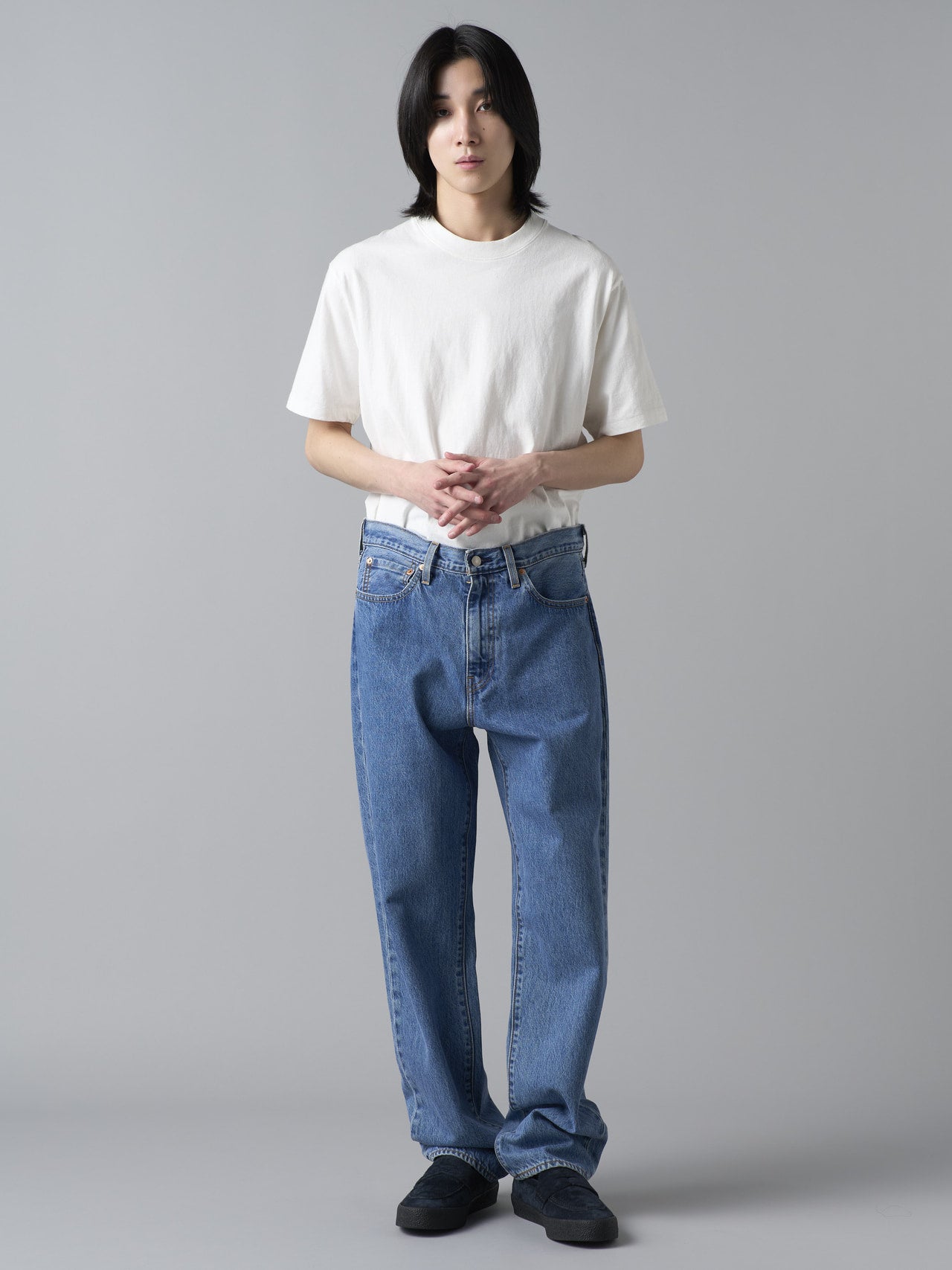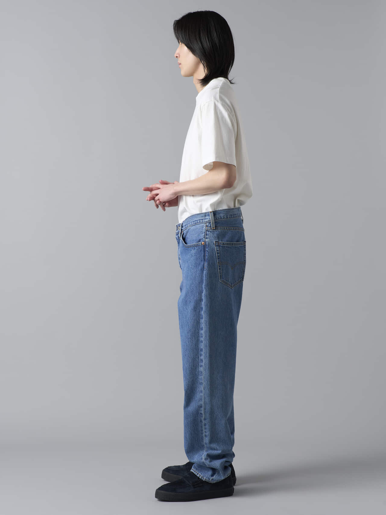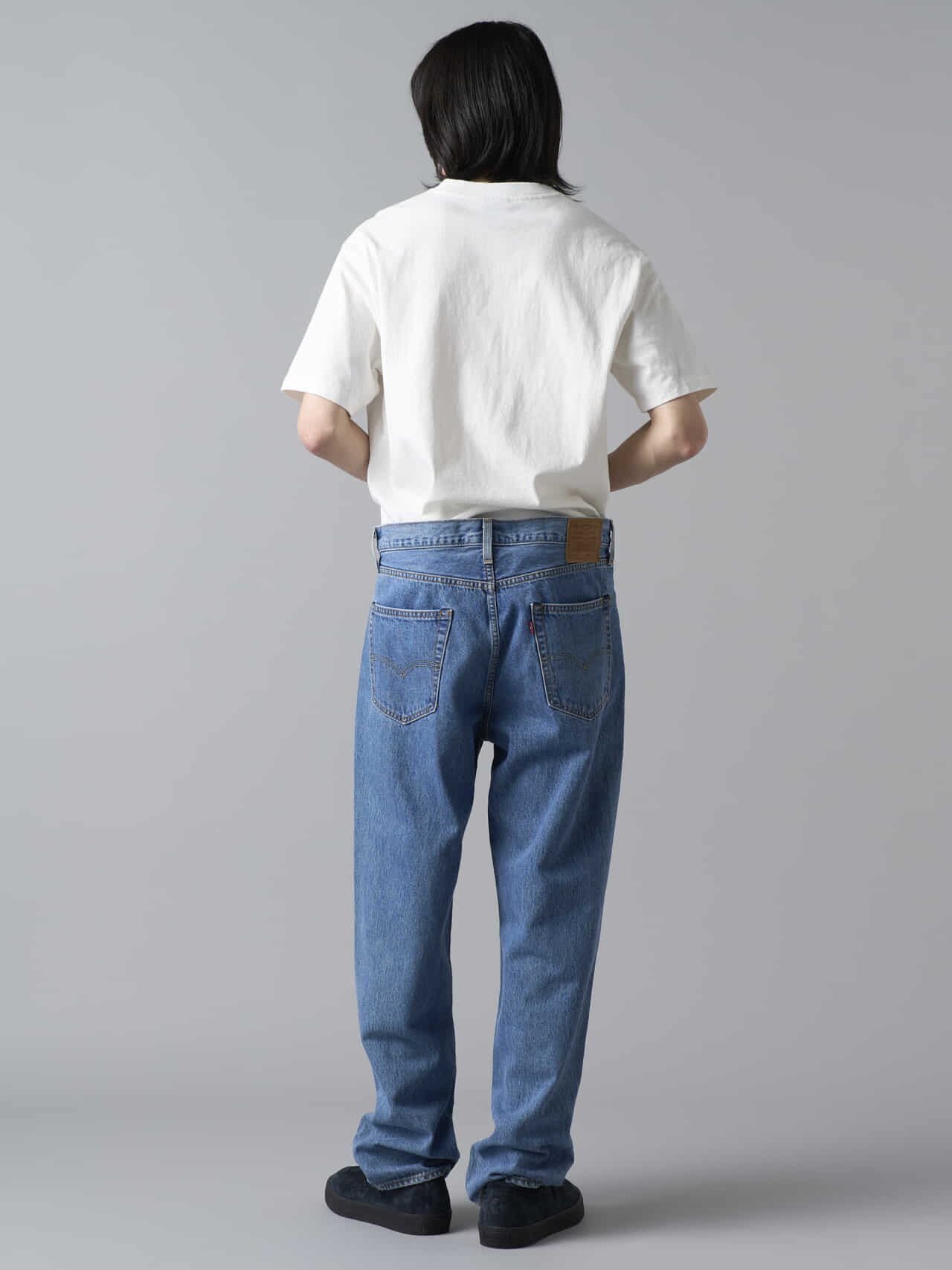 「アイテムはW32・L32を着用していて、程よくルーズなサイズ感! 腰回りから裾にかけて自然に落ちるラインで、ラフでありながらも野暮ったくならない絶妙なバランスが魅力。リーバイス®︎のジーンズをストリートカジュアルで穿くとき、1サイズか2サイズ上げて穿くこともあると思いますが、これならジャストサイズでも良さそうです。程よく色落ちしたブルーも古着っぽくて好みです!」。