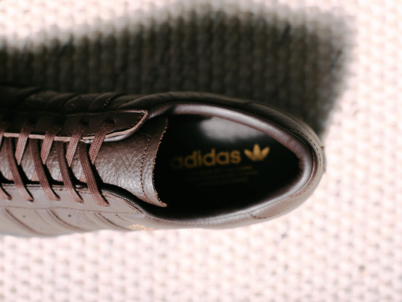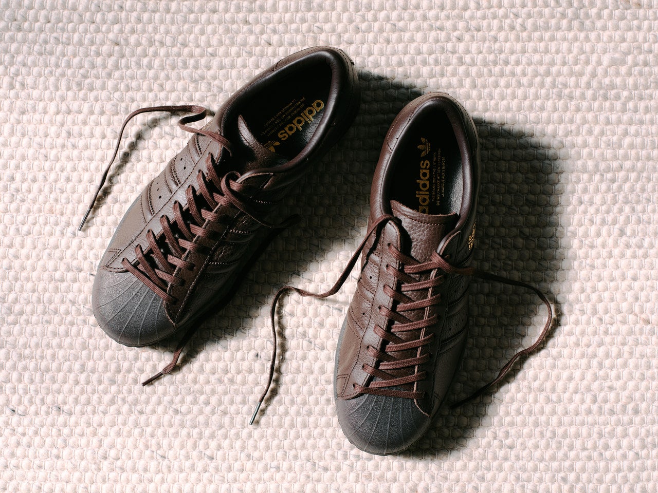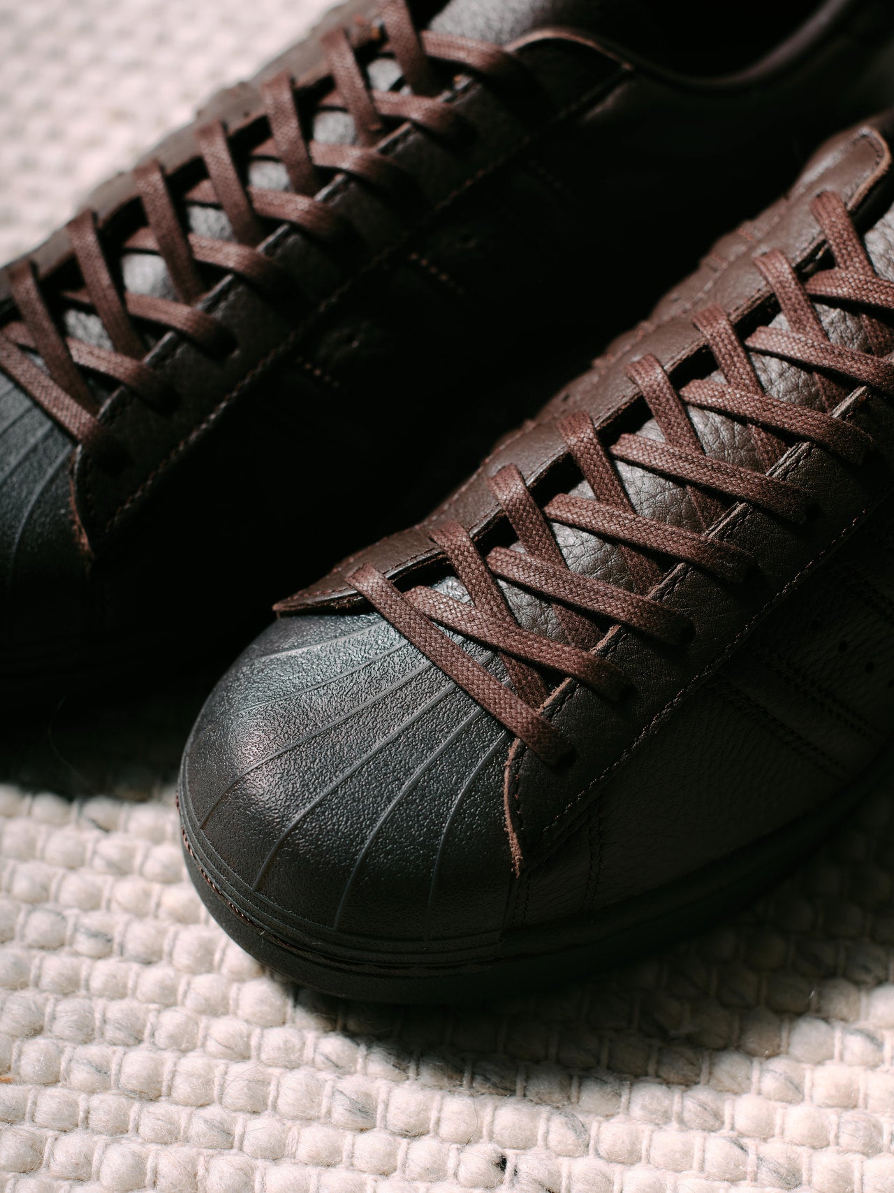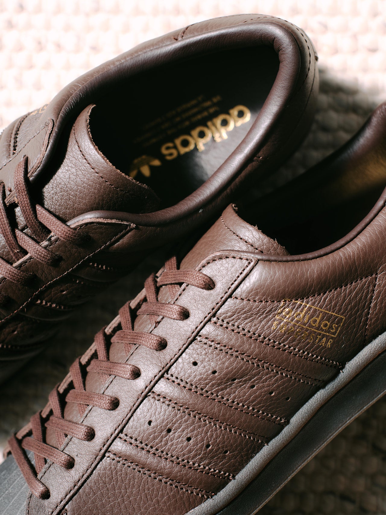 「ストリート色の強い『スーパースター』ですがこれはいい。写真のブラウンの他にブラックも展開されていて、どちらもシボレザーの上質な素材の質感を感じられるのが魅力で、クラシックなセットアップにも合わせられるんですよね。特徴的なシェルトゥはスタイリングのアクセントにも光ります」。