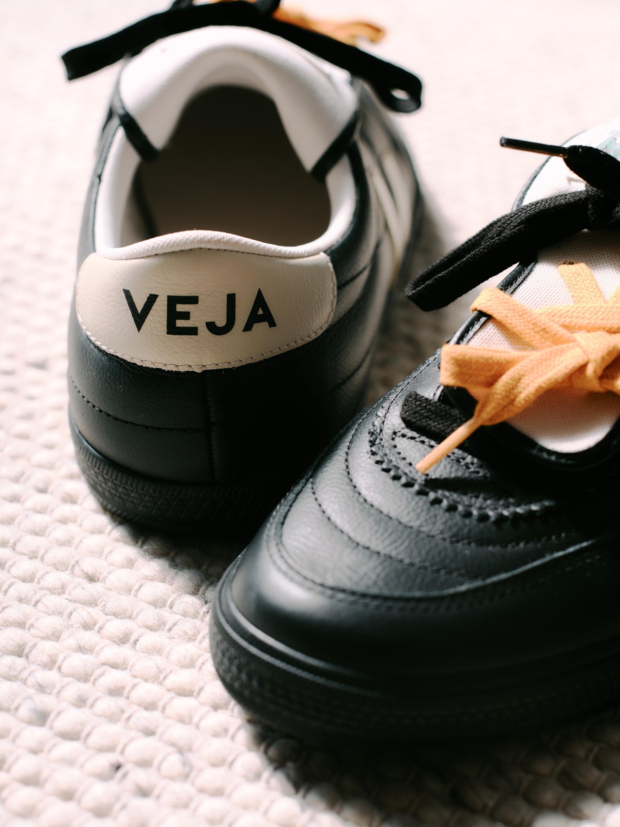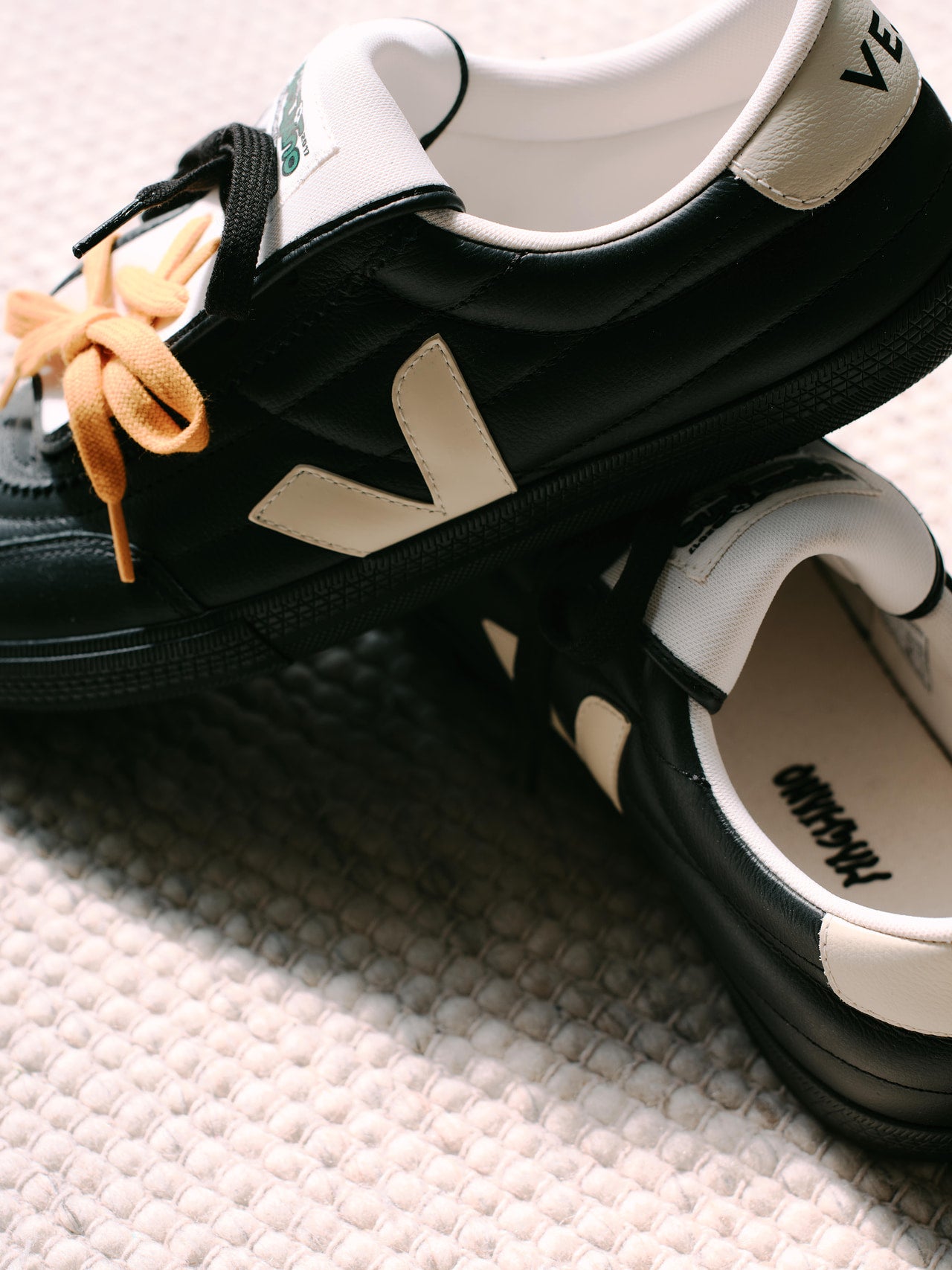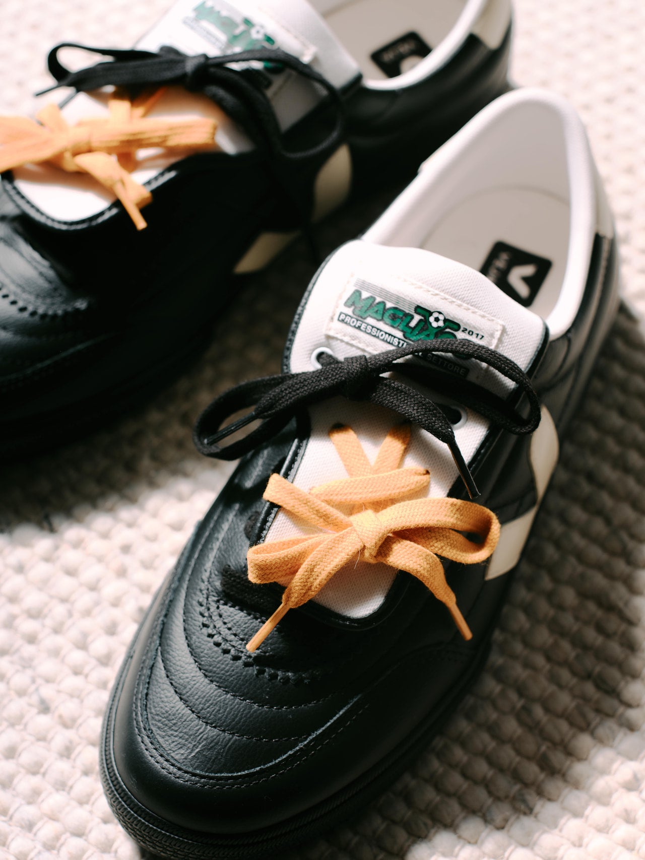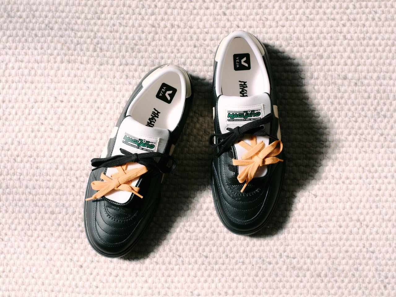 ヴェジャとマリアーノのコラボレーションスニーカーは、ヴィンテージのサッカーブーツから着想を得て、ヴェジャの「パネンカ」を再解釈。アッパーを覆うオーバータンにマリアーノのロゴを配し、一枚仕立てのアシンメトリーなシュータンには穴が開いており、シューレースを通すことが可能に。3組のシューレースが付属しており、自由に組み合わせを楽しめるのがポイント。シューレースのつけ方や組み合わせは人それぞれだが、トレンドのイエローを使うのがメンズノンノ的におすすめ。