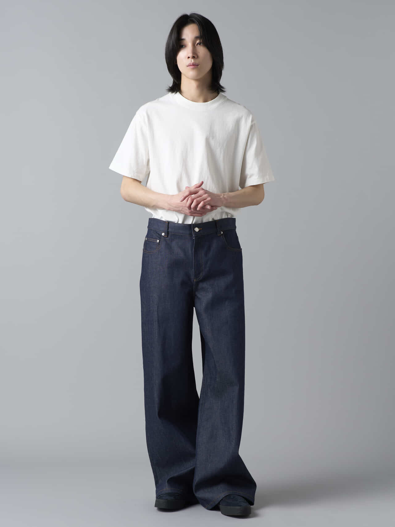「レディースライクなシルエットですが、しっかり腰回りにゆとりがあるので穿きやすいですね。バックシルエットも綺麗。後ろポケットにバンダナを差すのもよさそうです」(メンズノンノモデル 四坂 亮翔)
