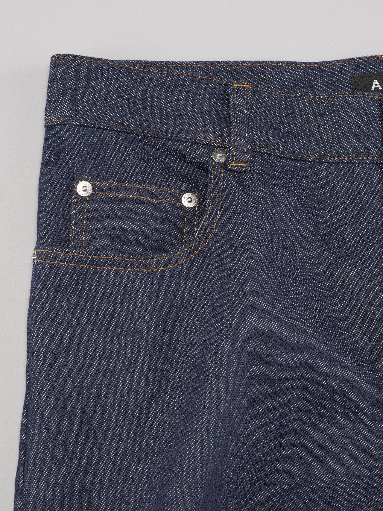 生地は日本製の生デニム。日本製ならではの上質さのなかに、同色のステッチや“剣とギター”ボタンといったアー・ペー・セーらしいミニマルで洗練されたディテールが光る。