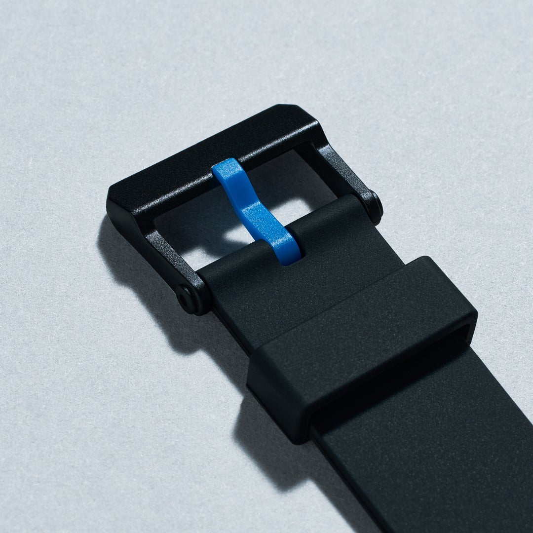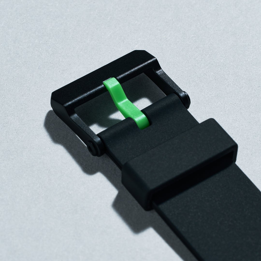 水泳時も着用できる10気圧防水仕様。子どもから大人まで使えるサイズになっているとのこと。秒針・ベルト穴・つく棒にはファミリーマートカラーをあしらわれていて、ほどよいアクセントに。