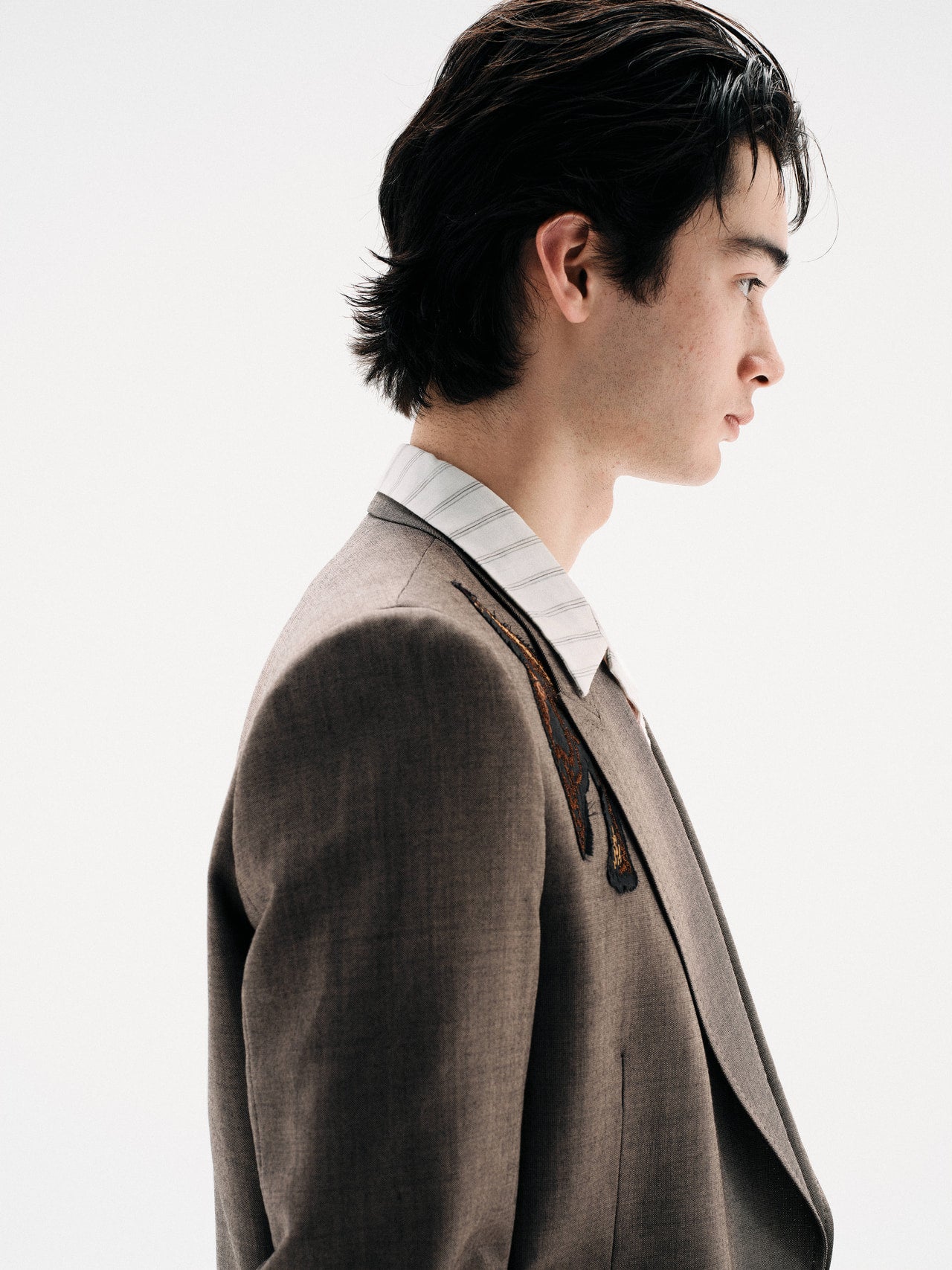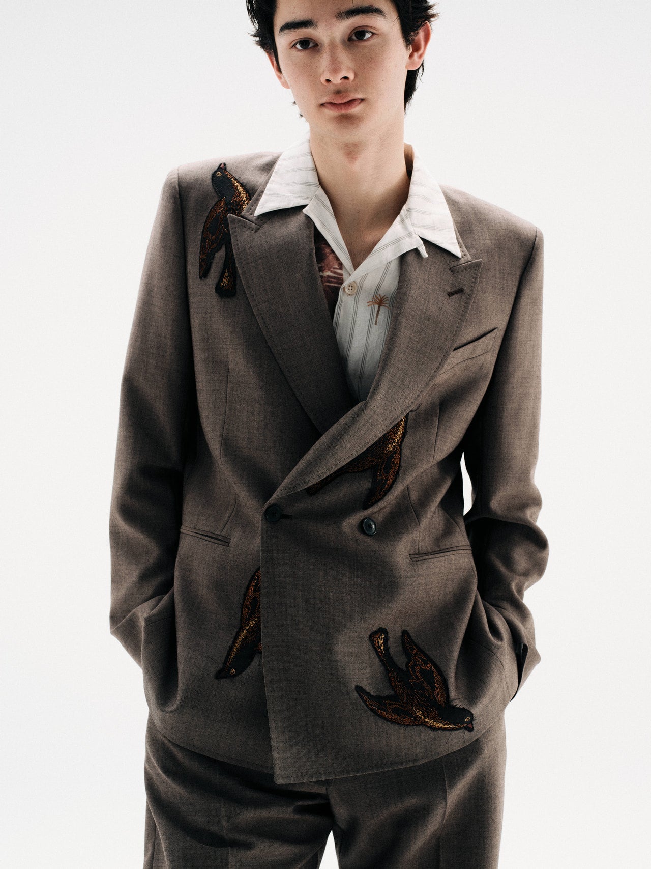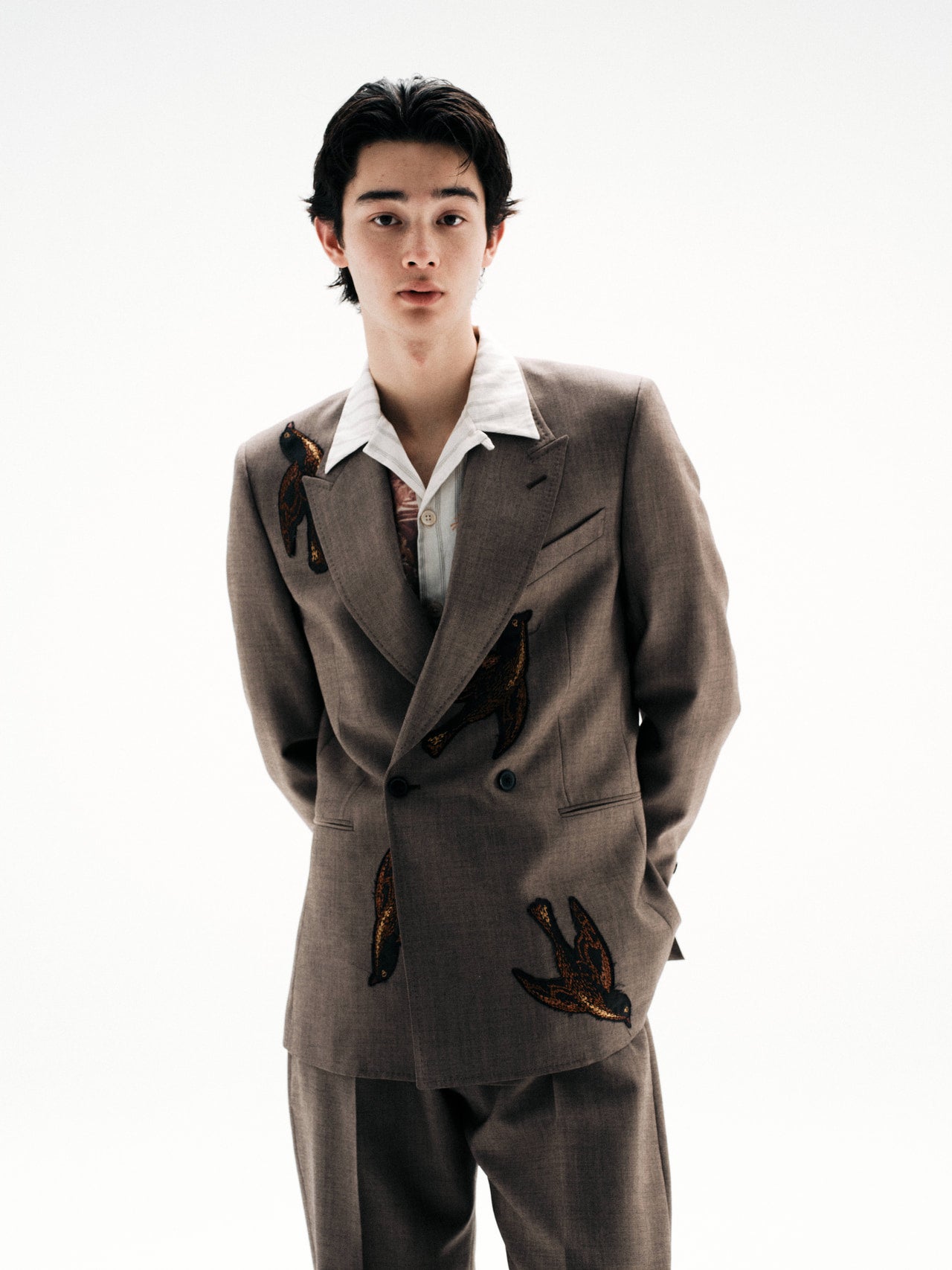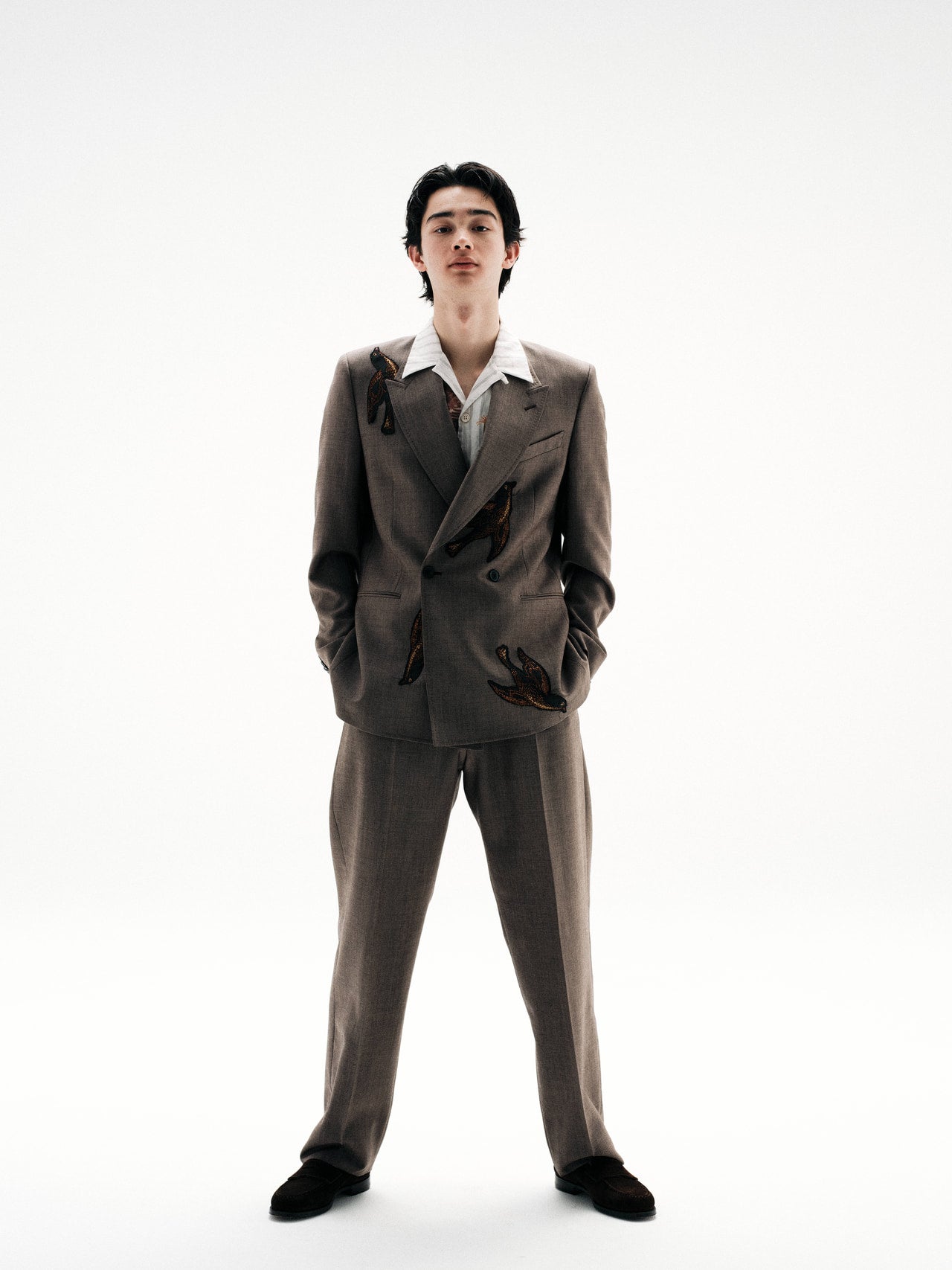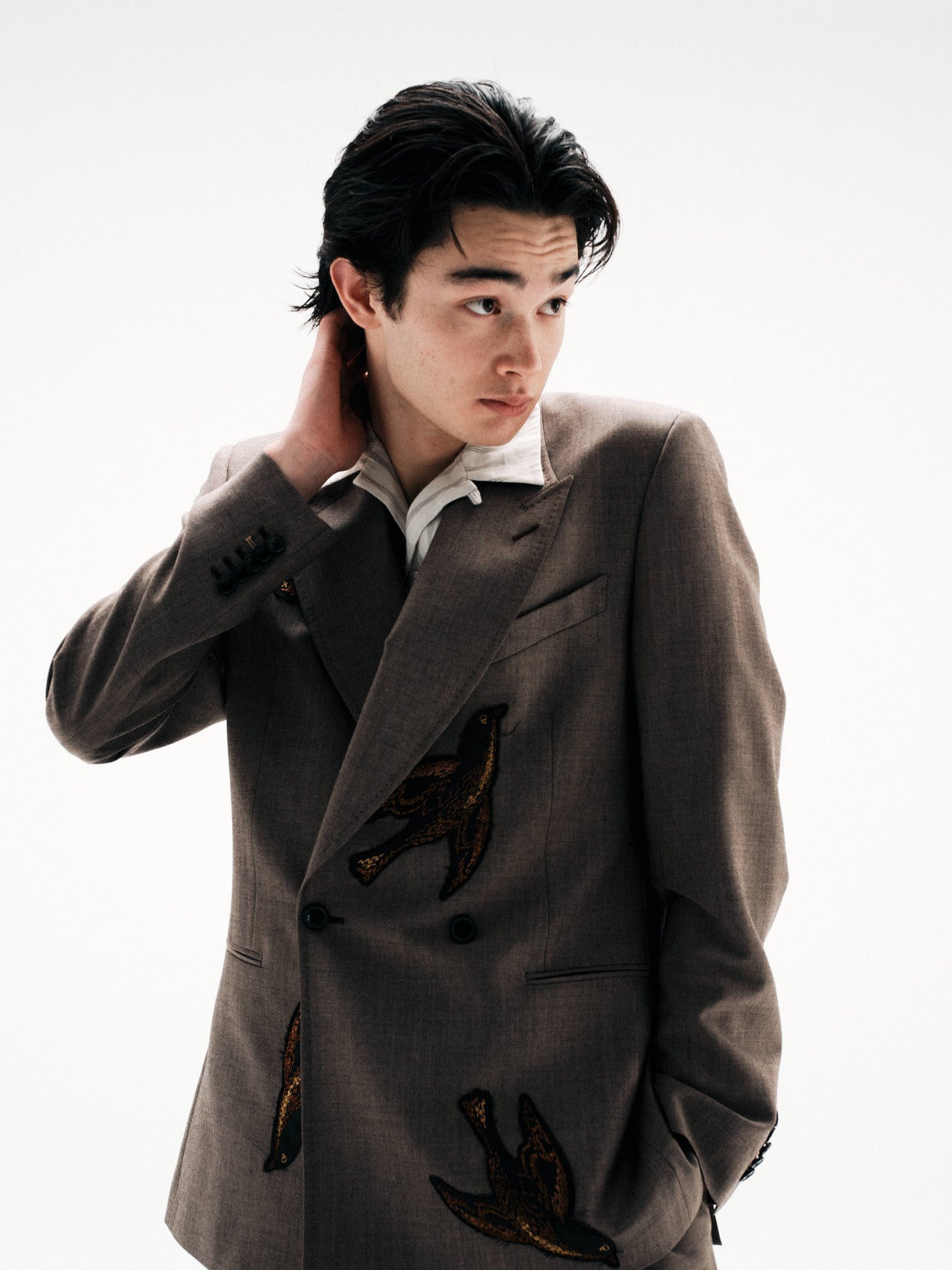 「2つボタンのダブル仕立てで、随所に施された鳥の刺繍がアクセントになっていますね。パンツのテーパード感も魅力。Vゾーンが少し狭めなので、柄の開衿シャツで抜け感と色気を出して着るのがおすすめ」。