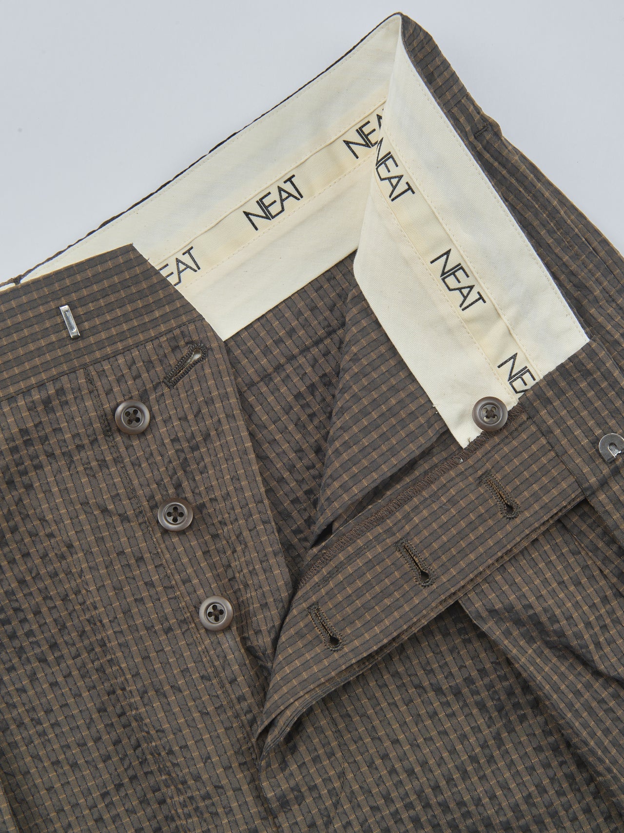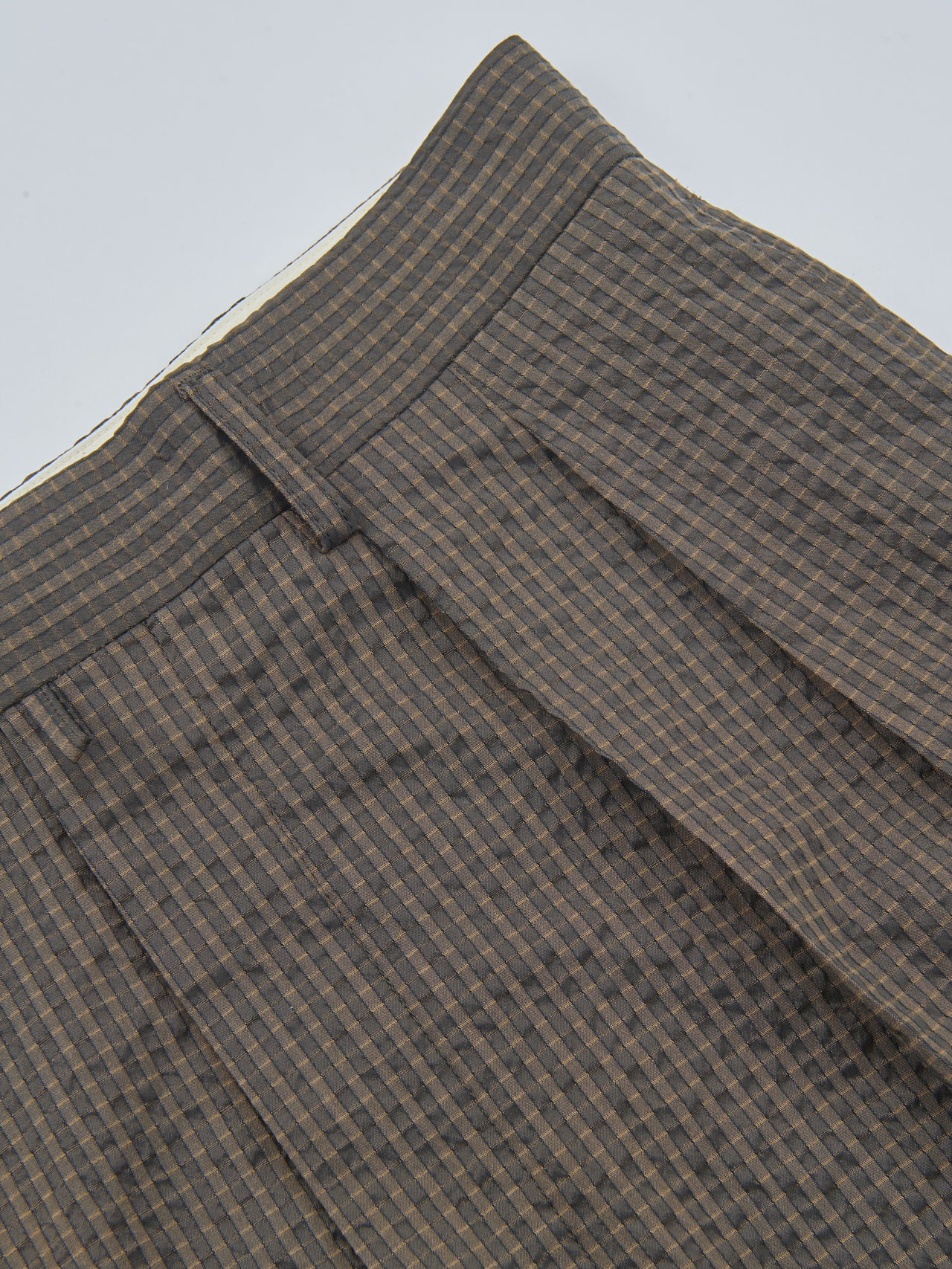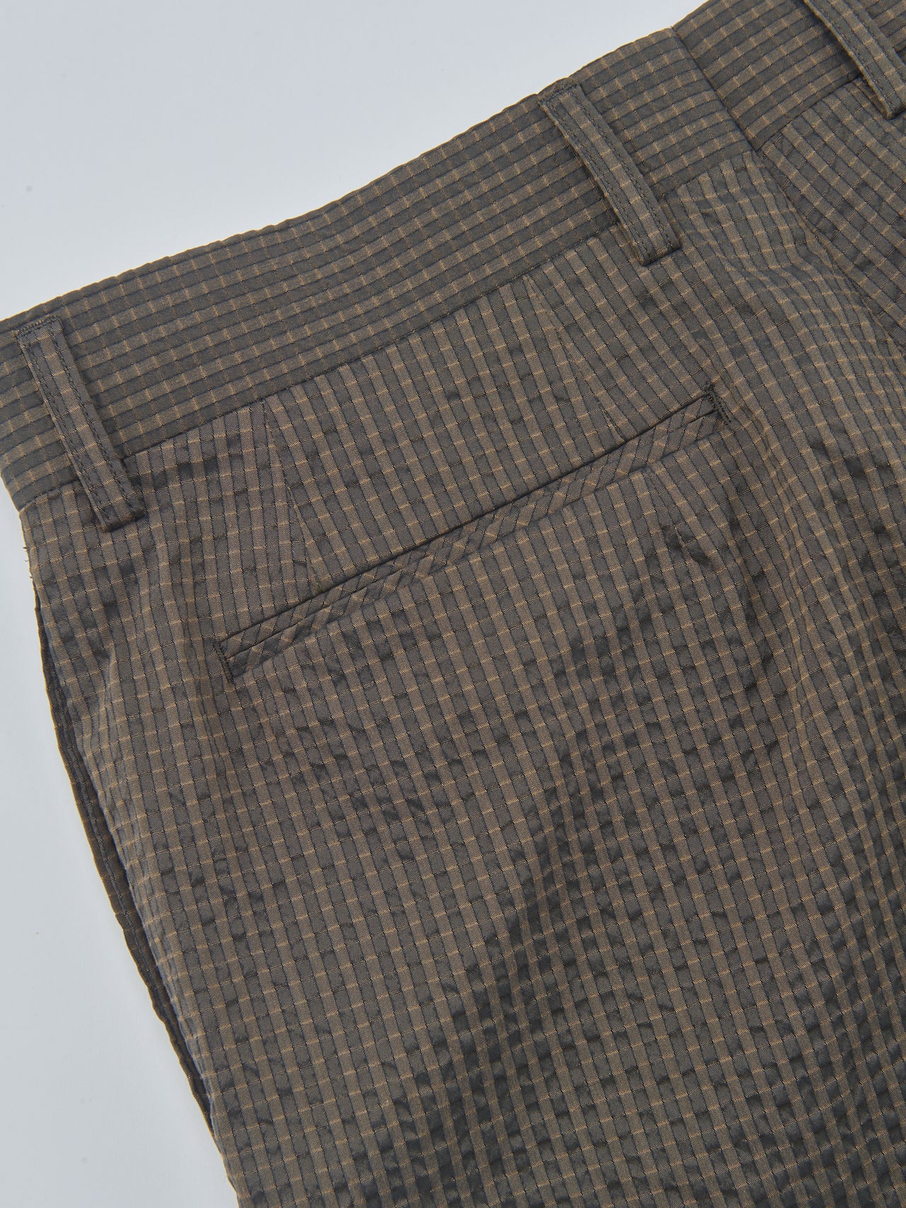 「日本の春夏に適した機能性素材を使用した“NEATパンツ”。クラシックなディテールながら、小さな穴があることで抜群の通気性を誇り、清涼感のあるシアサッカー素材で肌あたりも非常にいいのがポイントです」。