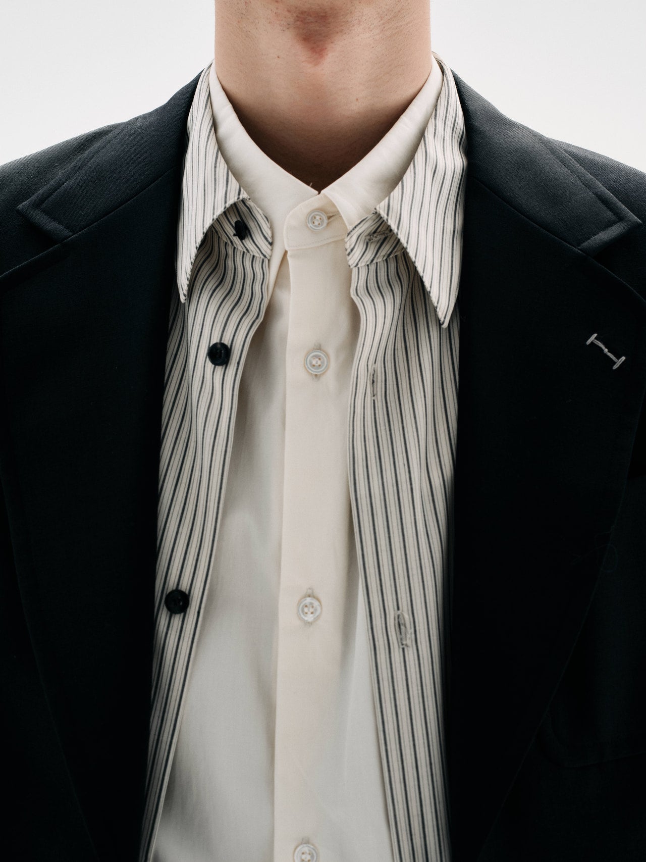 「白シャツとストライプシャツのシャツ オン シャツという新鮮な組み合わせも周りと差をつけるコツ。色味は合わせてまとまりのあるスタイリングに」。