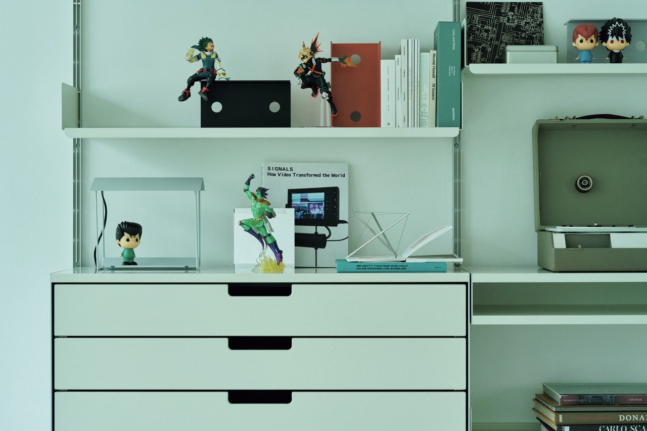 置き方に悩むという声をよく聞くフィギュアですが、プラスチックなどを加工した〝工業製品〟と捉えるとスタイリングの幅が広がるかもしれません。例えば、インダストリアルなブックエンドの上に置く。工業的な質感で合わせられるだけでなく、倉庫で戦っているような臨場感も出ます。ポイントはインテリアアイテムとフィギュアの共通点を探すこと。その意味では、映したものを平面に閉じ込める鏡と、二次元の世界を立体化したフィギュアも相性がよさそうです。存在感を引き立てるライトアップには、空間になじむ暖色を。4本の柱が特徴のデスクランプは、展示ケースのような〝枠〟の役割も果たします。こんなふうに一つひとつ飾り方を工夫すると、キャラクターへのリスペクトも高まるはずです。