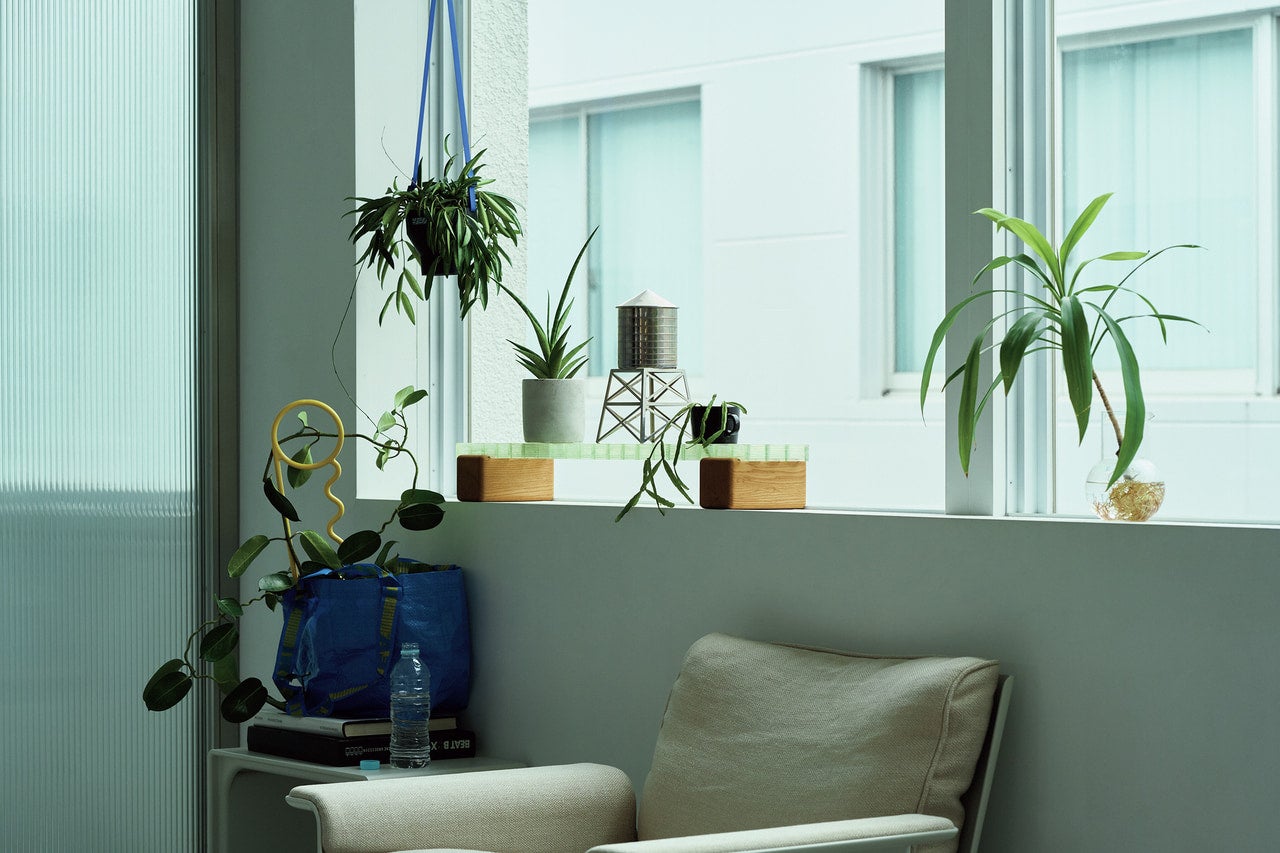 陶器製の鉢に入れて床に置く。観葉植物といえばそんな飾り方を想像しがちですが、ありきたりに見せない方法もあります。例えば、プランターボードを下に敷く。兵庫県発のマジカル ファニチャーのものは軽やかな色と質感がアクセントになります。無数の穴が通気口になるので、根腐れを防ぐ効果も。ストラップで鉢を吊り下げて高さを出すのもおすすめ。特に韓国発のサンデー プラネット47のものは、意外性のある工業的なデザインがポイントです。茎やツルの支柱には、80年代ムードのある色と形状の「プラントピン」を。植物が倒れにくくなり、インテリアとしての存在感も高まります。鉢選びに迷ったらバッグをカバーとして使ってもよし。自由な発想で観葉植物を楽しんでください。