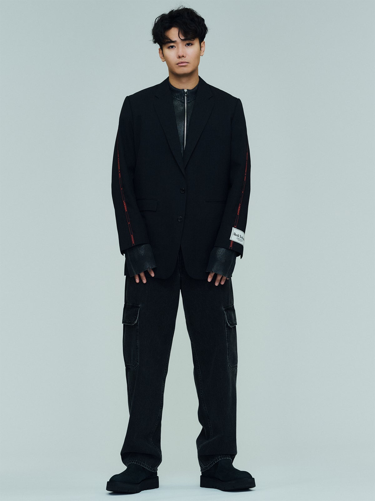 ジャケット(シーク ヤブーティ)¥162,800/スタジオ ファブワーク[TEL:03-6438-9575] ニット¥91,300/ディーゼル ジャパン[TEL:0120-55-1978] パンツ(リーバイス®︎)¥16,500/リーバイ・ストラウス ジャパン[TEL:0120-099-501] 靴(ホワイトマウンテニアリング × ダナー)¥66,000/ホワイトマウンテニアリング[TEL:03-6416-5381]