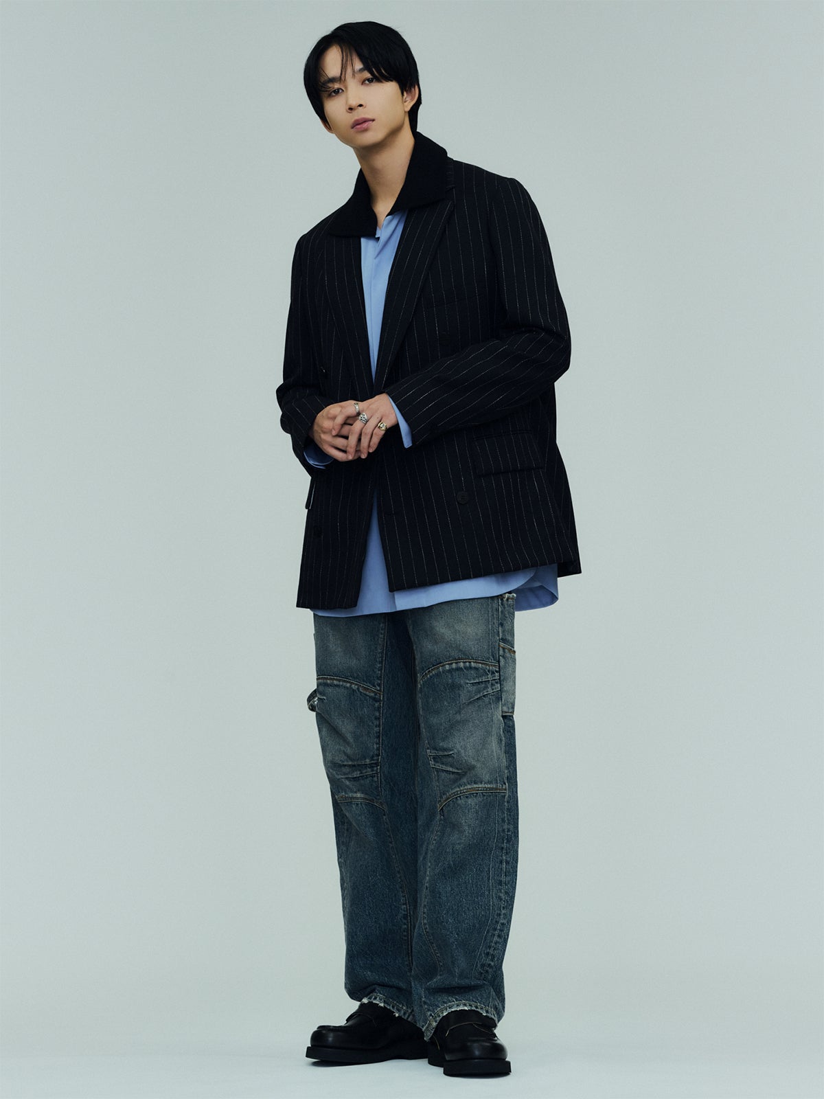 ジャケット¥135,300・シャツ¥83,600(ともにオーバーコート)/大丸製作所3[MAIL:info@overcoatnyc.com] パンツ¥99,000/ダイリク[MAIL:info@dairiku-cinema.com] 靴(ネペンテス × フット ザ コーチャー)¥79,200/ネペンテス[TEL:03-3400-7227] リング/本人私物