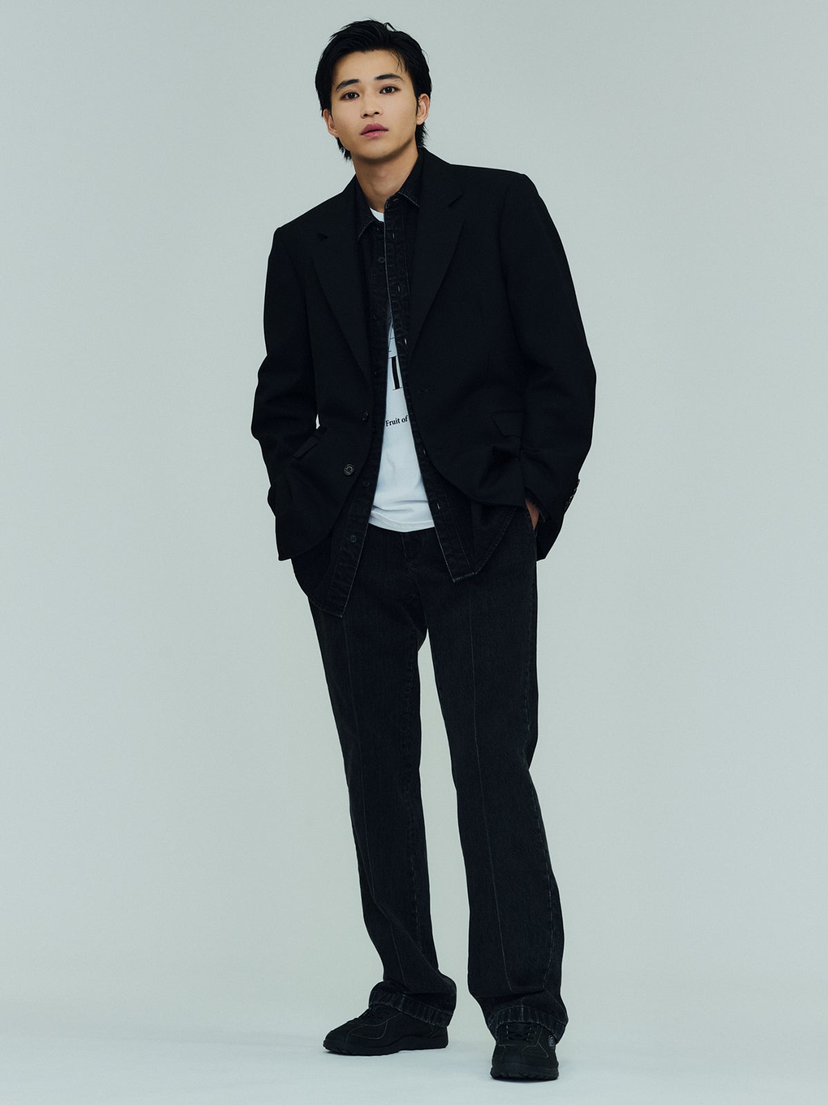 ジャケット(マーカウエア)¥88,000/パーキング[TEL:03-6412-8217] シャツ¥52,800・パンツ¥52,800(ともにシーヴ)/ブリーズ[MAIL:contact@ceive.jp] Tシャツ(フルーツオブザルーム)¥3,960/ギャレット[TEL:03-6845-7770] 靴(ホワイトマウンテニアリング × アンブロ)¥36,300/ホワイトマウンテニアリング[TEL:03-6416-5381]