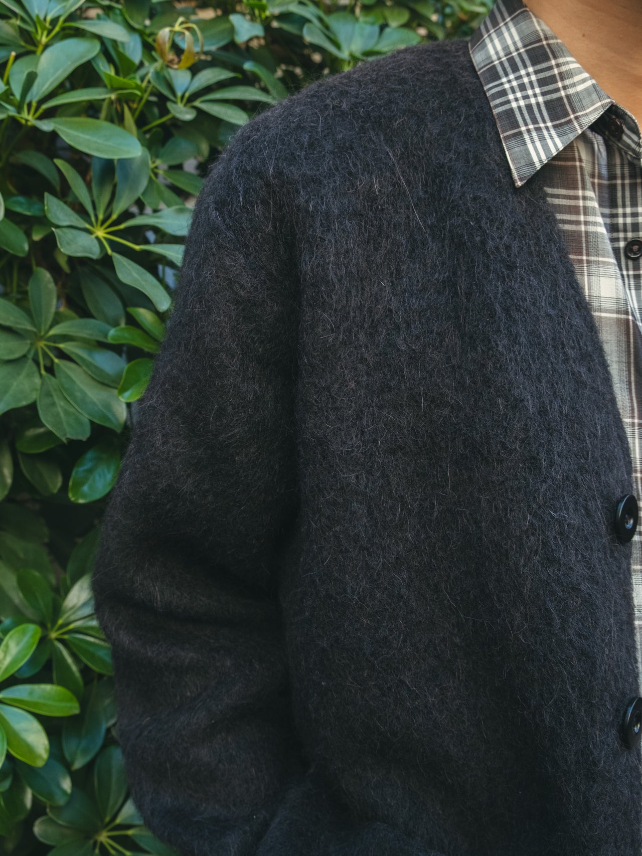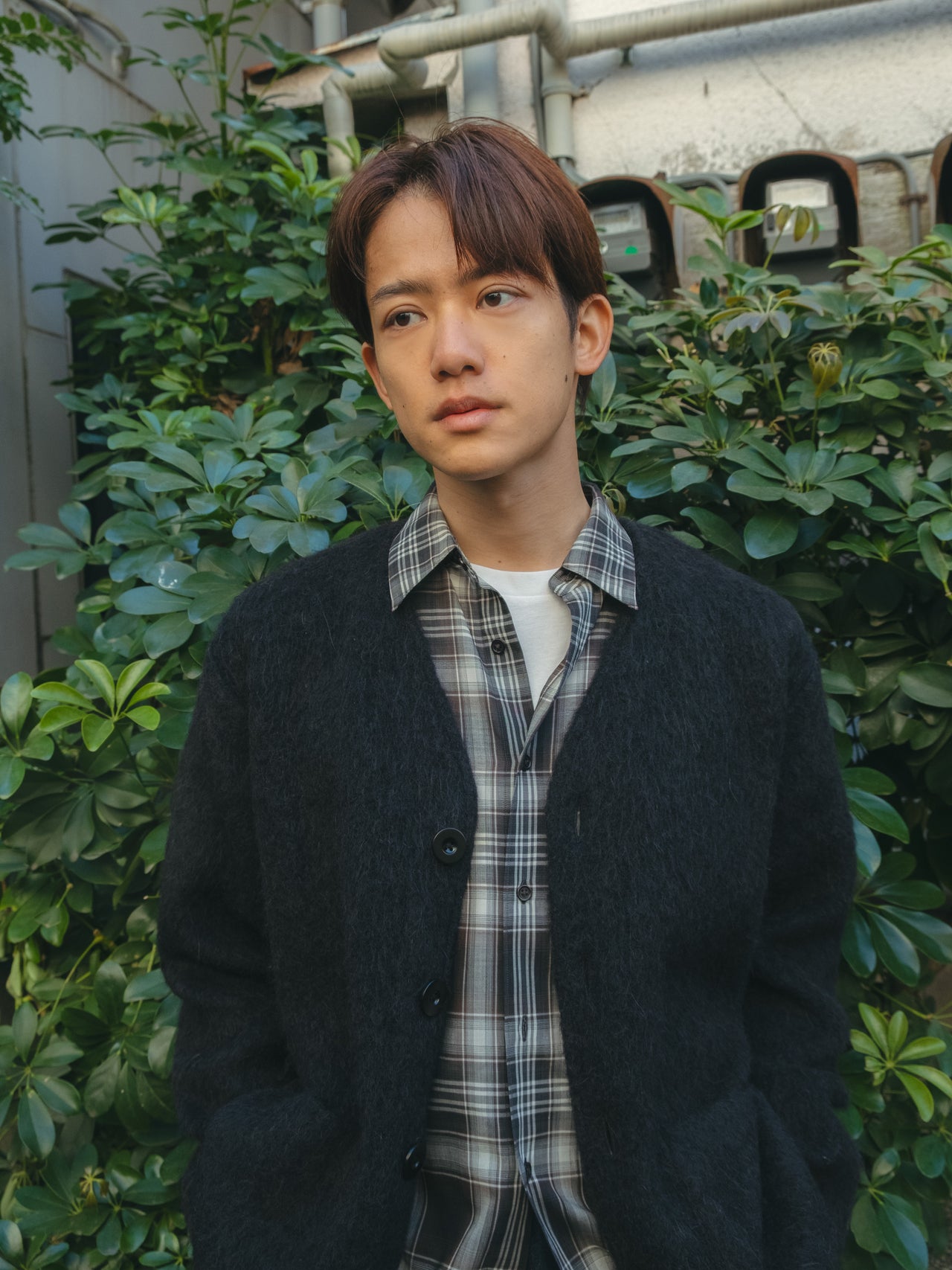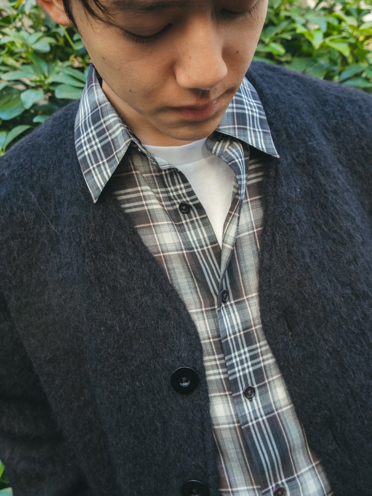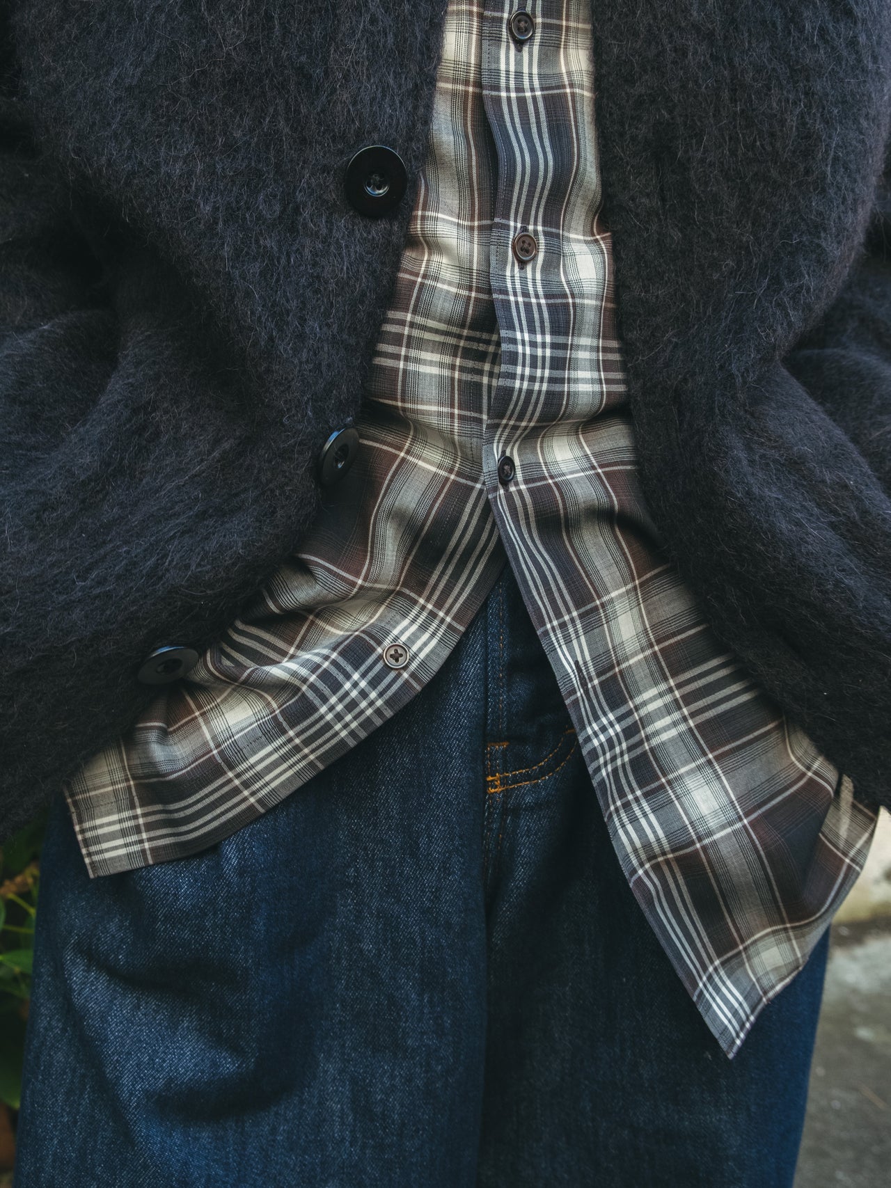 「トップスはアワーレガシー定番のモヘアカーディガンとオーラリーのチェックシャツのコンビネーション。カーディガンはウールとアルパカの混紡生地で、ほどよい厚みで今の季節にぴったり。シャツも白と黒をベースに、さりげなくブラウンの糸も使われていて、スタイリングをなじませてくれます」。