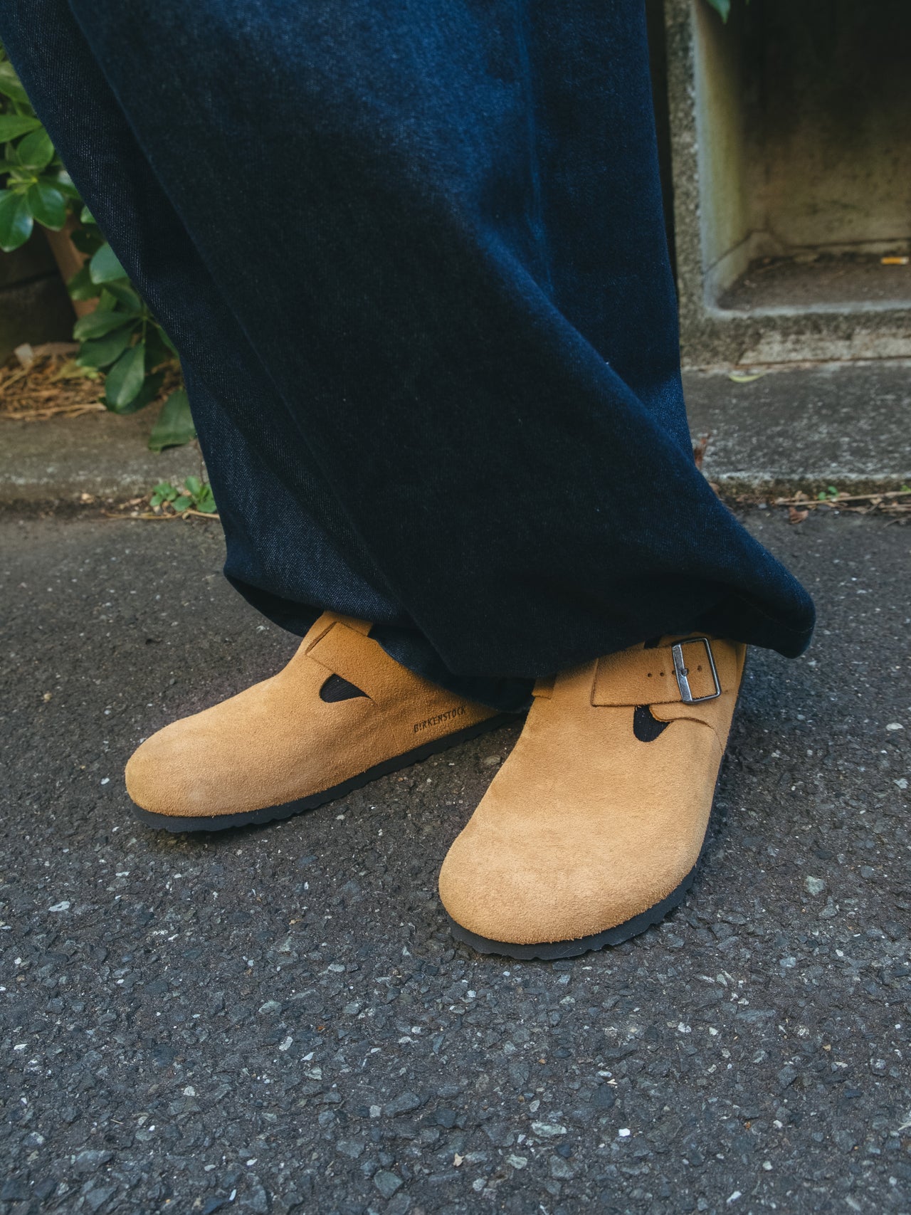 「そのワイドパンツと相性抜群なのがビルケンシュトックの1足。新色のコルク ブラウンは、どんな服装にも合わせやすいのが特徴。個人的にフットベッドのコルクは好きなので気に入っています。デニムとも好相性。丸みを帯びたトウ(つま先)はボリューム感があり、コーディネートに可愛げをもたらしてくれるのも魅力」。