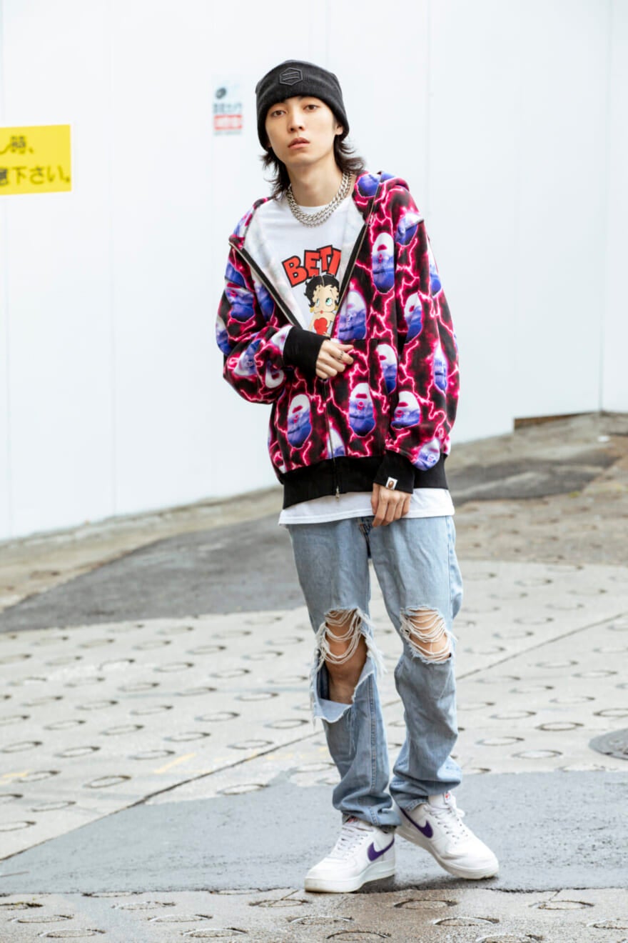 『派手で存在感あるパーカに、自分でリメイクしたジーンズを合わせてみました! 中に着ているBettyBoopのTシャツは最近一番のお気に入りです。』